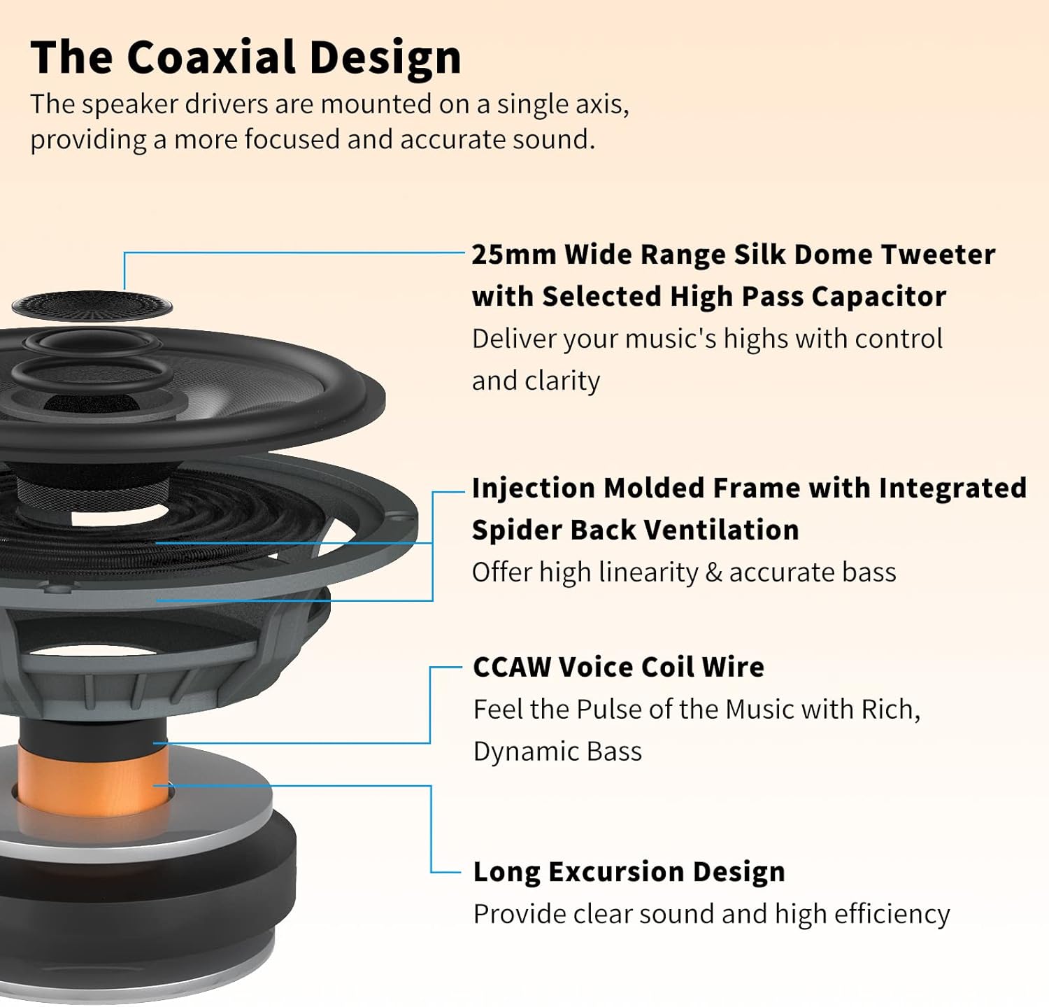 - 【Höchste Klangverbesserung】Entdecken Sie den ATOTO CS-651DC, unsere innovative koaxiale 2-Wege-Lautsprecher. Geniessen Sie präzise und klare Bassklänge von einem 6-1/2 Zoll (16,5 cm) grossen Konus-Tieftöner. Der 1 Zoll (2,5 cm) grosse