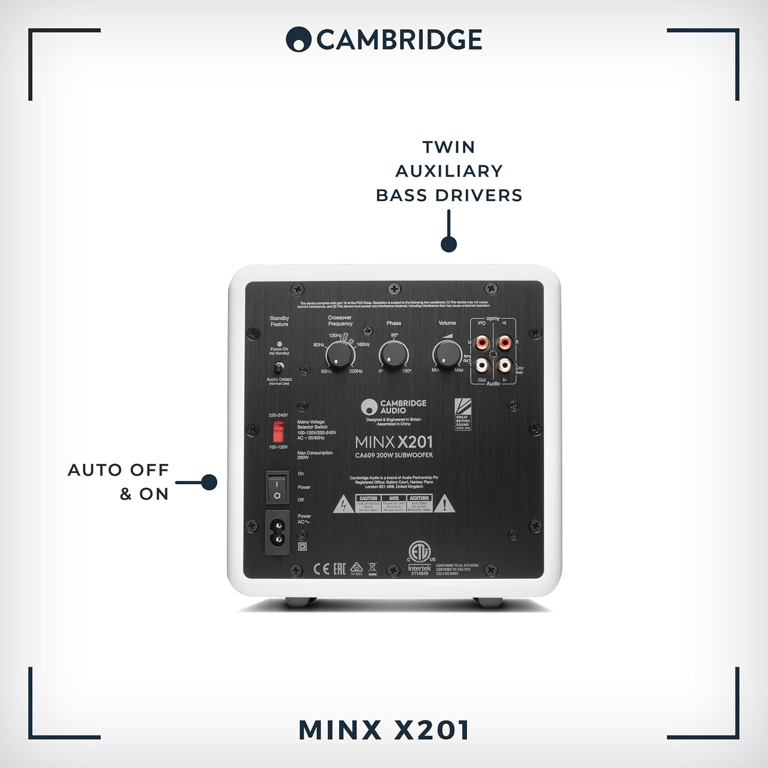 - Lautstärke- und Frequenzkontrolle – Stimmen Sie den Klang des X201 auf Ihren Raum ab.