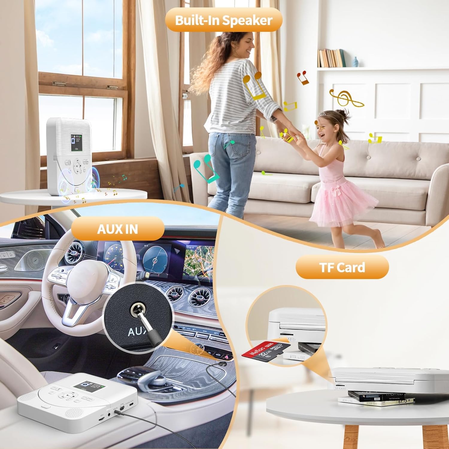 - 【FM-Übertragung & Car CD Player】Drücken Sie die FM-Taste für die drahtlose Kopplung mit Ihrem Auto. Im Lieferumfang ist ein 3,5-mm-AUX-Kabel enthalten, mit dem Sie den CD-Player an Ihr Auto oder andere externe Lautsprecher anschliessen können.