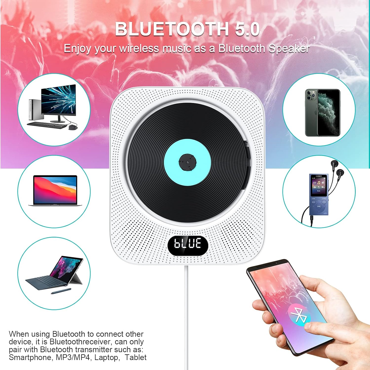 - 【Bluetooth 5.0 CD-Player】 Die neueste Bluetooth 5.0-Technologie wird auf diesem neuen aktualisierten tragbaren Wand-CD-Player angewendet, der einen grösseren Signalbereich, eine schnellere Verbindung und Übertragungsgeschwindigkeit bietet. Mit