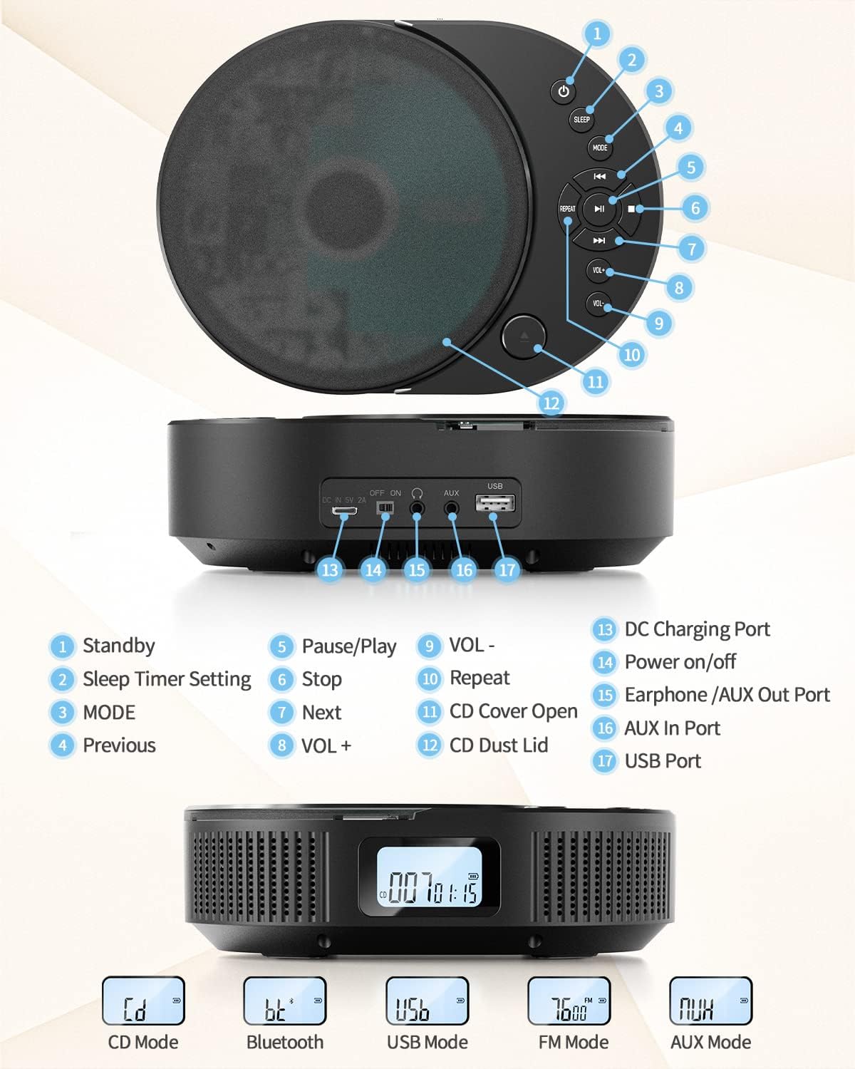 - đăWiederaufladbarer CD-PlayerăDer tragbare CD-Player von FELEMAN verfĂŒgt ĂŒber einen integrierten 2000-mAh-Akku, sodass Sie ihn nicht stĂ€ndig aufladen oder AA-Batterien verwenden mĂŒssen.