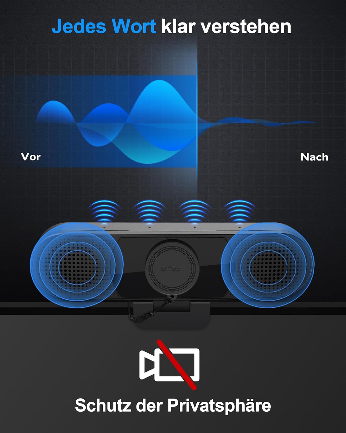 - 【4 Mikrofone & Lautsprechern】Die 1080P Webcam ist mit vier integrierten omnidirektionalen 360°Mikrofonen mit Rauschunterdrückungsfunktion und Echokompensationsfunktion ausgestattet, die externe Störgeräusche stärker eliminieren und die