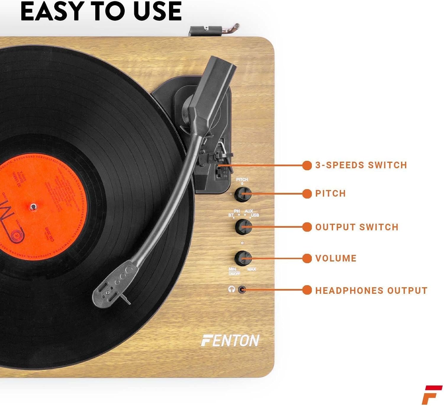 - RCA und Kopfhörer-Anschluss: Über den Cinch-Ausgang können Sie diesen Fenton Plattenspieler einfach an ein bestehendes Audiosystem anschliessen. Ausserdem gibt es eine Kopfhörerbuchse