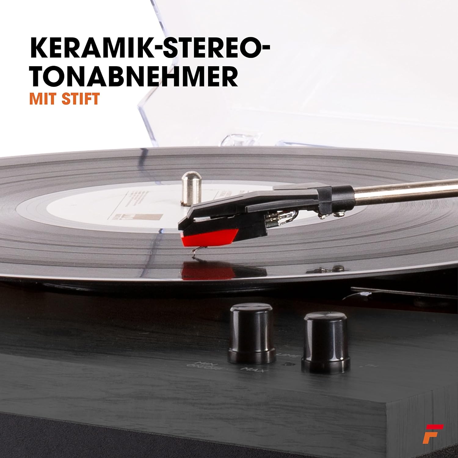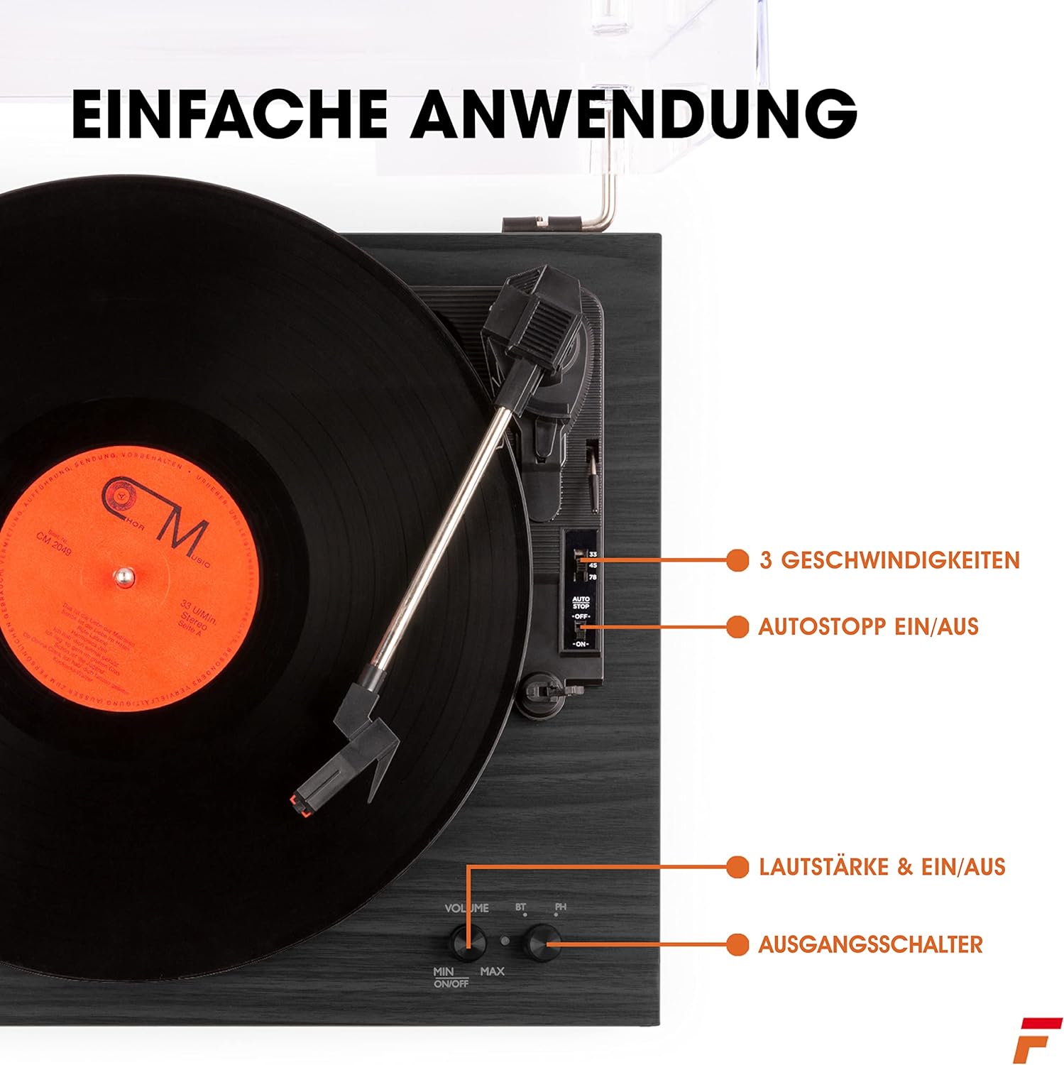 - Um zu verhindern, dass sich der Plattenspieler mit Boxen endlos dreht, gibt es eine automatische Stoppfunktion, die den Schallplattenspieler mit Lautsprecher am Ende einer Schallplatte anhält