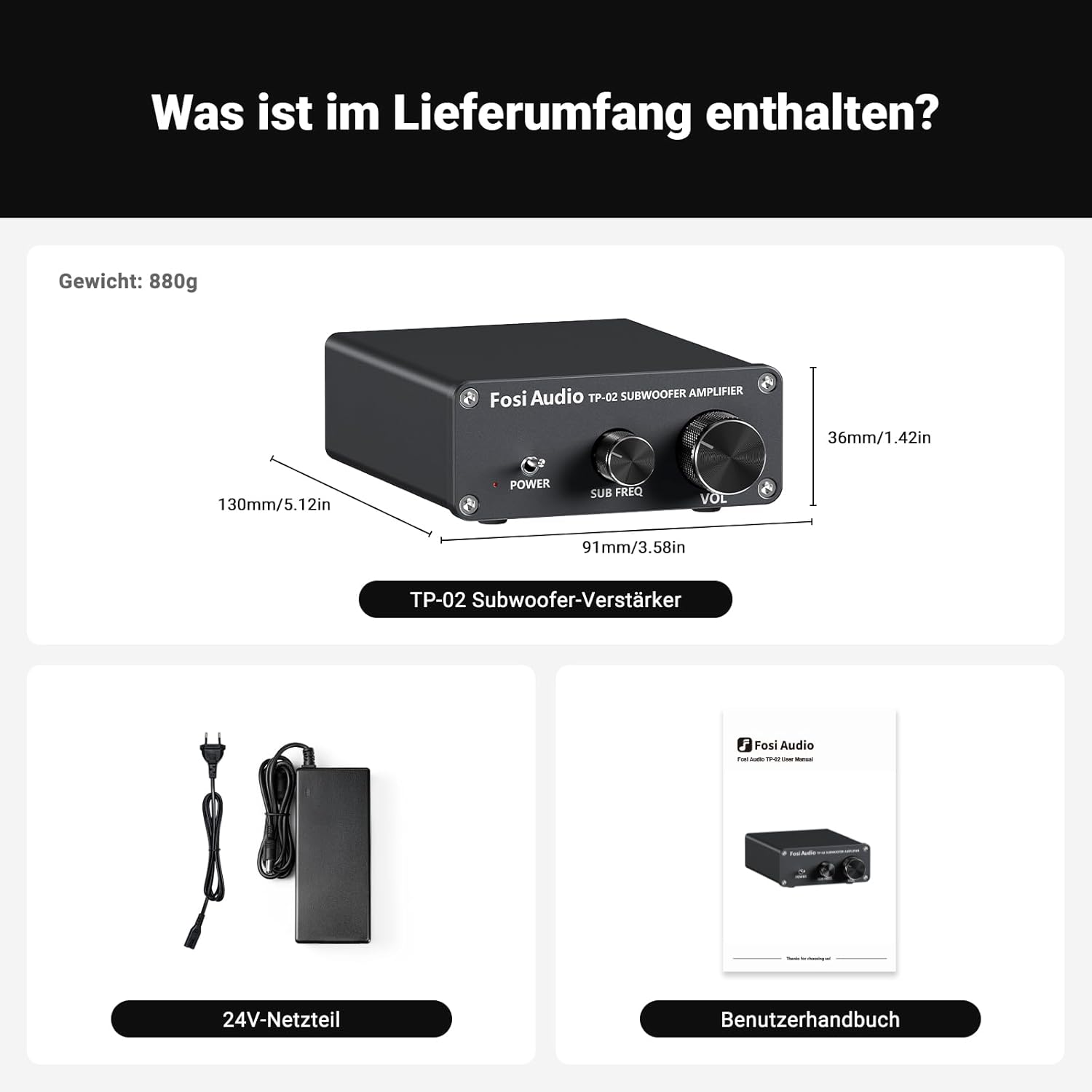 - Was Sie erhalten: TP-02 Subwoofer-Verstärker x1, Netzteil x1, Netzkabel x1, Bedienungsanleitung x1, 24-monatige weltweite Garantie und 24-Stunden-Schnell-Kundenservice.