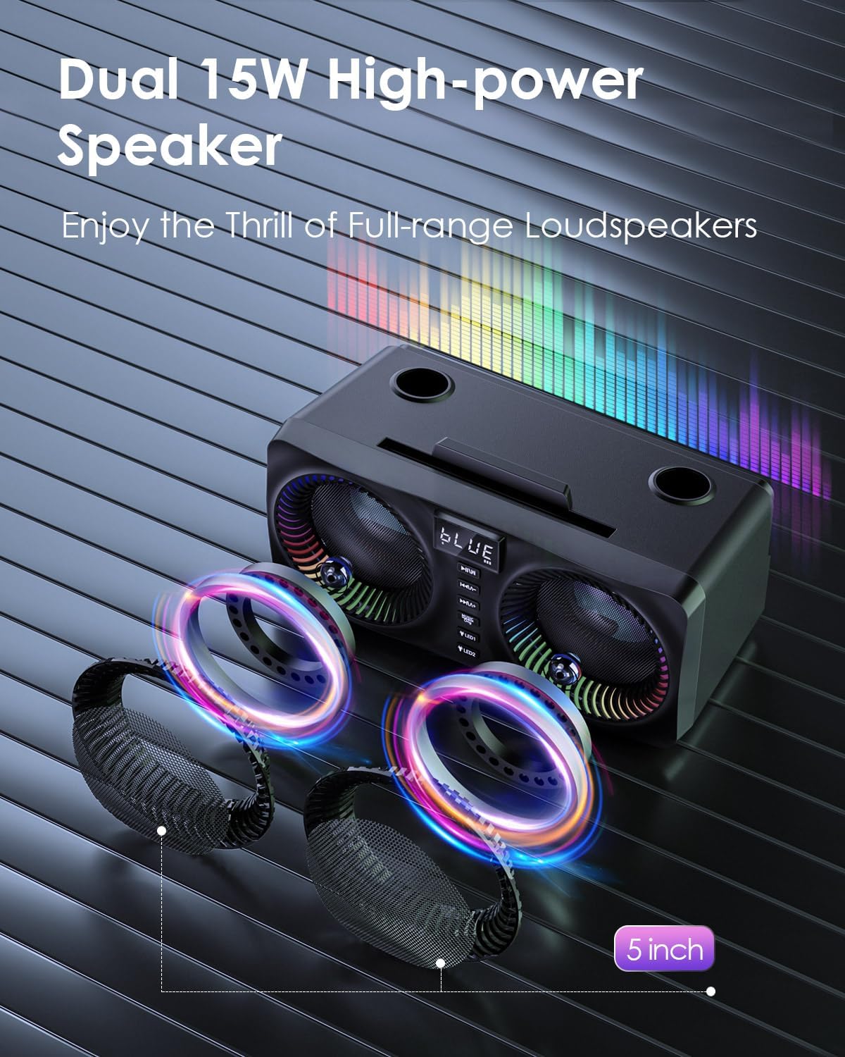 - 【Massgeschneidert für die Party zu Hause】 Das Erscheinungsbild kombiniert Retro-Klassik und coolen Technologiestil für den täglichen Gebrauch. Zwei 15-W-Lautsprecher und kreisförmige Lichter sorgen für ein beeindruckendes audiovisuelles Erlebnis.