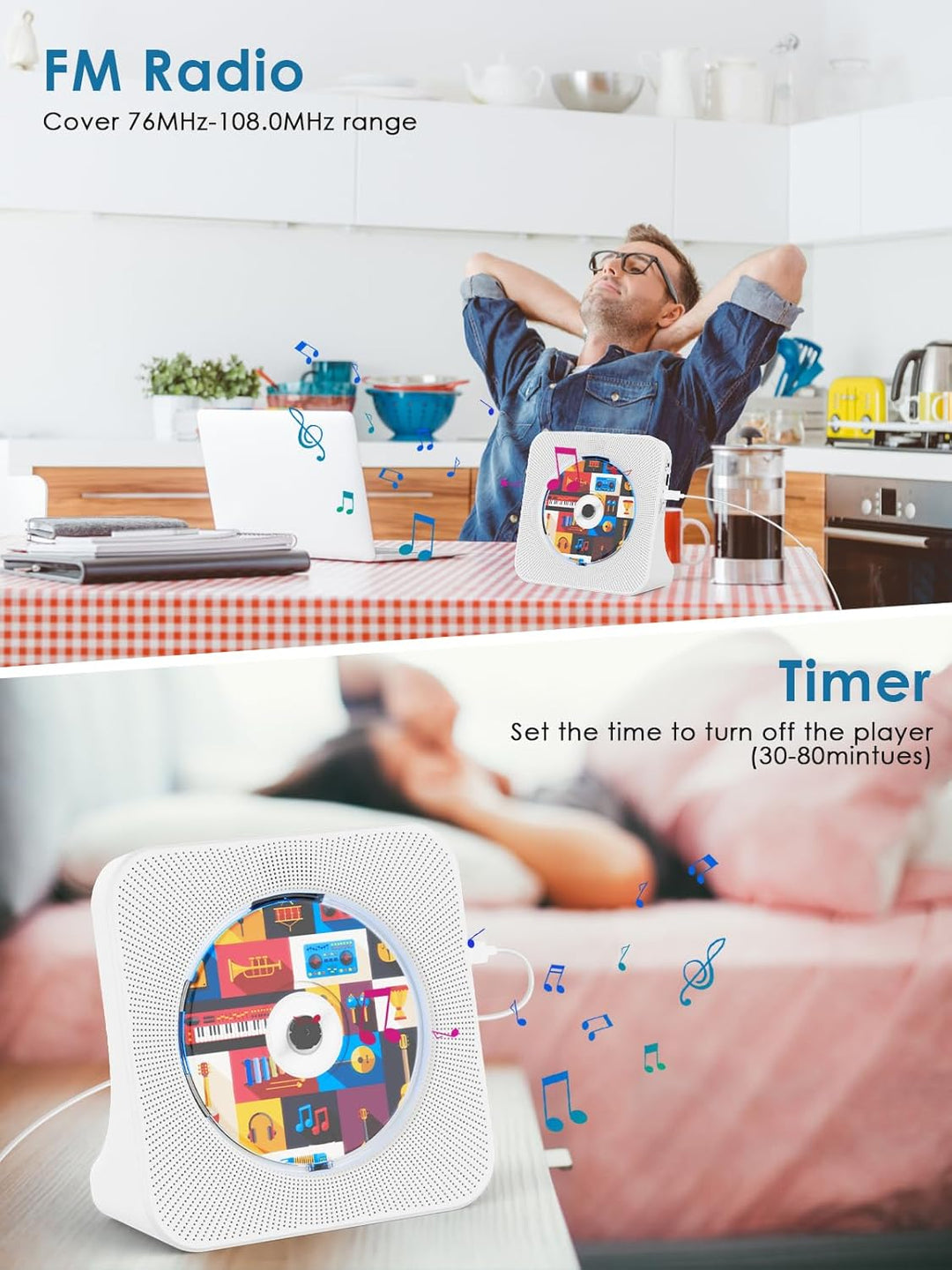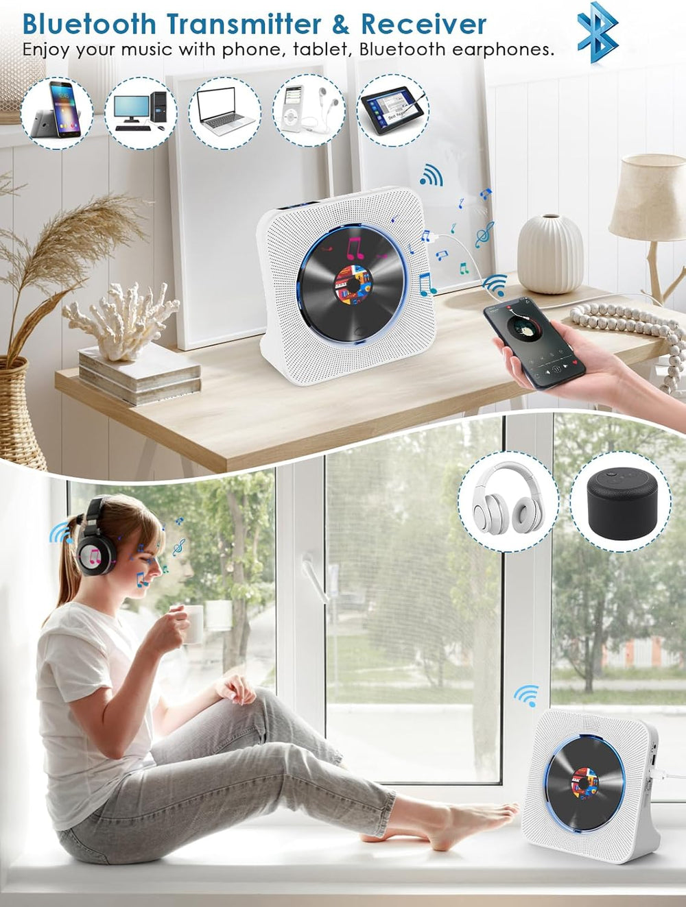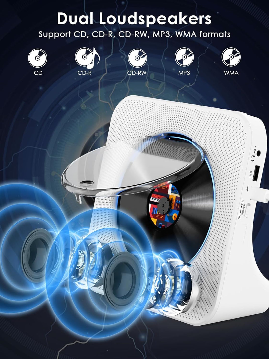 - Multifunktionaler CD-Player: 1. Desktop CD Player, 2. Bluetooth 5.0 Hi-Fi Lautsprecher, 3. FM-Radio, 4. USB Flash Drive Player, 5. 3,5 mm Audio-Player. Unterstützt CD, CD-R, CD-RW, MP3, WMA Audioformate. Der 5-in-1-CD-Player macht Ihr Leben bunter und