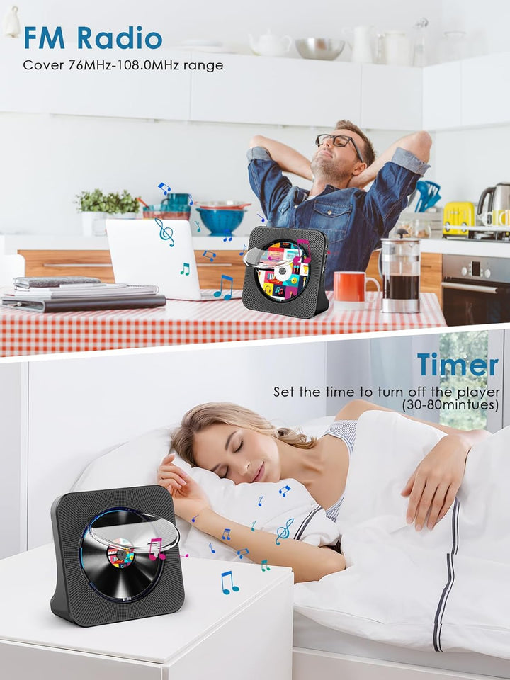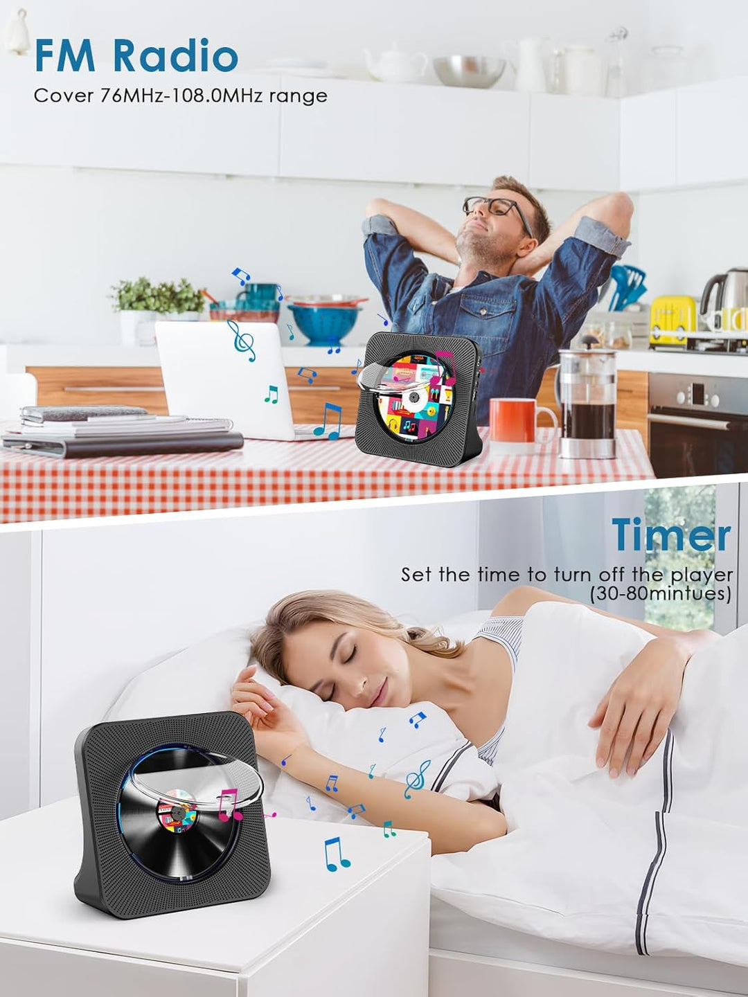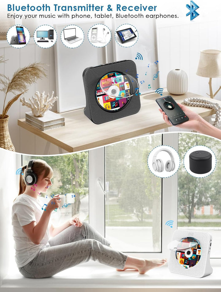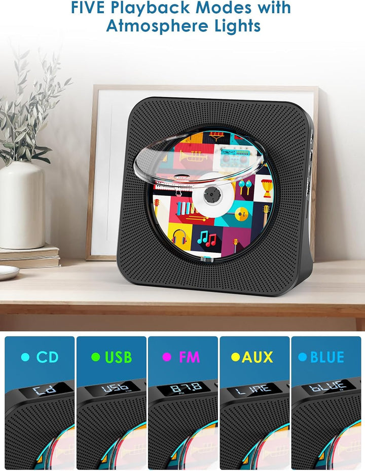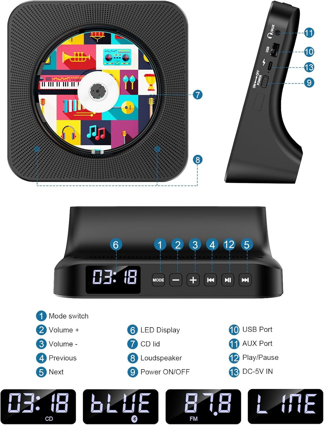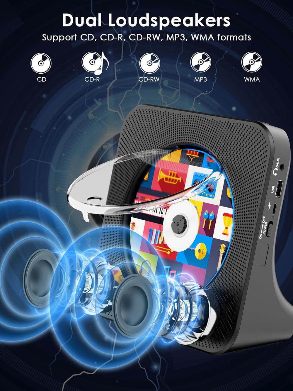 - Multifunktionaler CD-Player: 1. Desktop CD Player, 2. Bluetooth 5.0 Hi-Fi Lautsprecher, 3. FM-Radio, 4. USB Flash Drive Player, 5. 3,5 mm Audio-Player. Unterstützt CD, CD-R, CD-RW, MP3, WMA Audioformate. Der 5-in-1-CD-Player macht Ihr Leben bunter und
