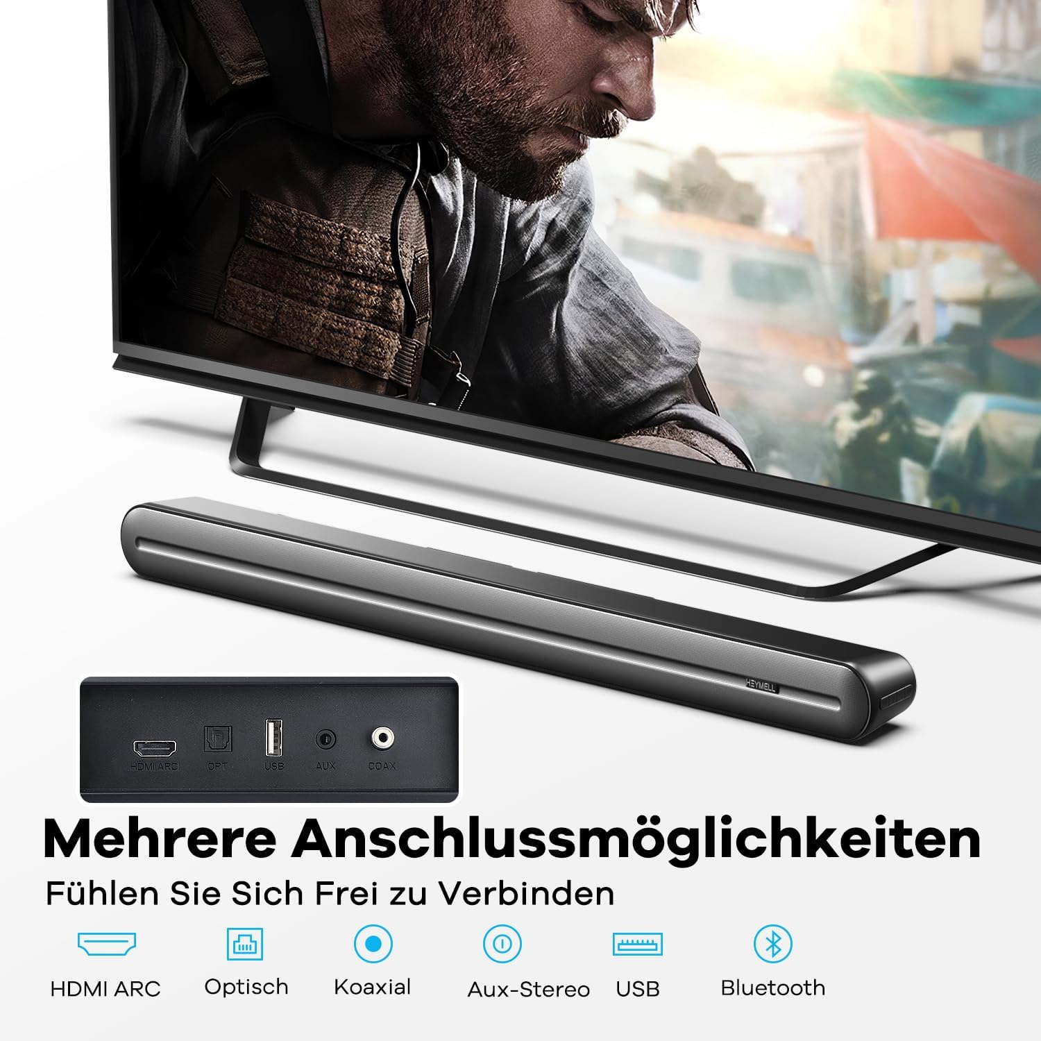 - Mehrfache Konnektivität: Verbindungen enthalten Bluetooth, HDMI ARC / Optical / Aux-Kabel / Koaxial, funktioniert mit 32 Zoll bis 55 Zoll Smart TV und Monitor, Projektor, DVD-Player, etc. Über HDMI ARC, schalten Sie die Soundbar ein / aus und stellen