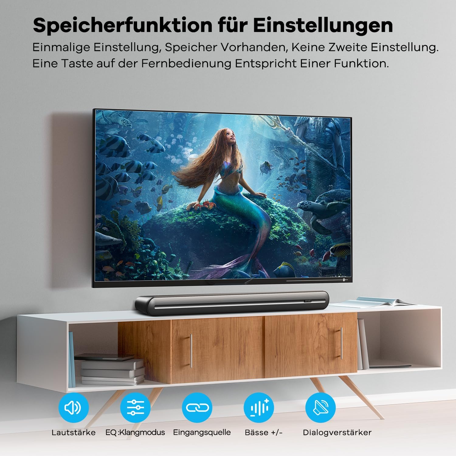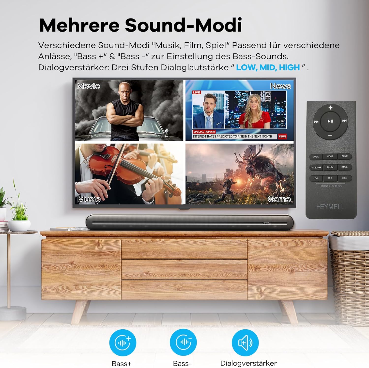 - Drei Klangmodi & Dialogverbesserung: Drei Sound-Modi „ MUSIC, MOVIE, GAME“, Dialog Enhancer: vier Level Dialog / Sprachlautstärke auf jedem Sound-Modus, MUSIC / MOIVE / GAME, LOW, MID, HIGH. Erhalten Sie verschiedene Dialugue / Sprache