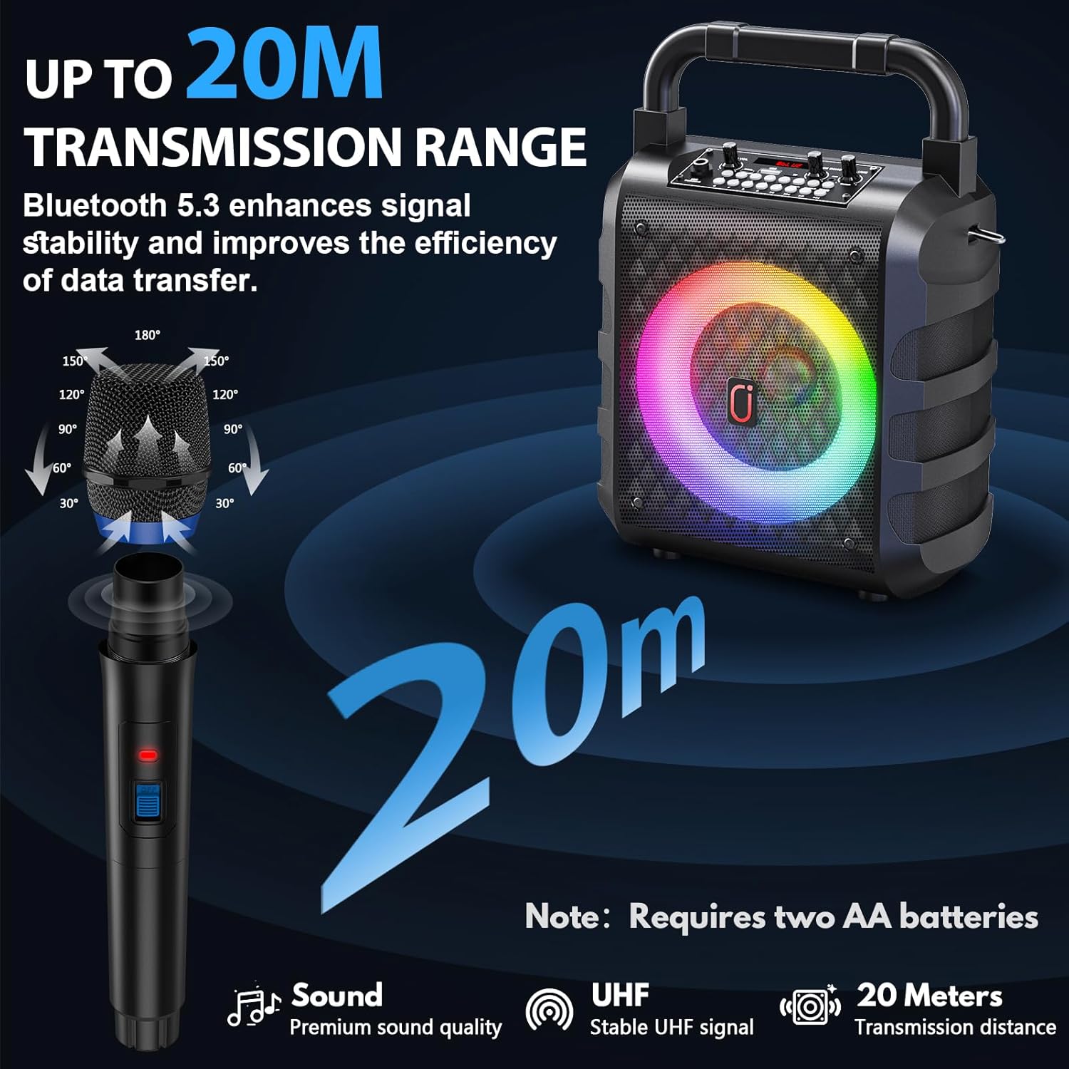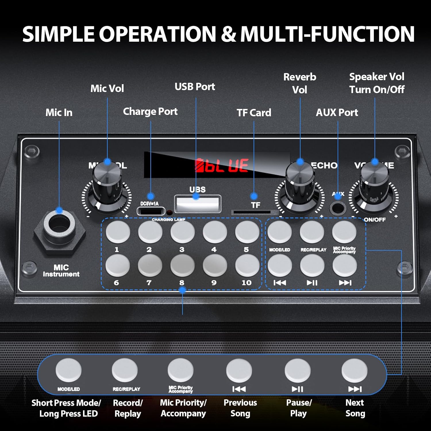 - VIELE ANSCHLUSSMÖGLICHKEITEN & KOMPATIBLE GERÄTE: Der kabellose Karaoke-Lautsprecher unterstützt verschiedene Verbindungsarten, darunter Bluetooth 5.3, TF-Karte, USB-Stick, Typ-C und AUX-Eingang. Die Signalreichweite beträgt stabile 15 Meter und ist