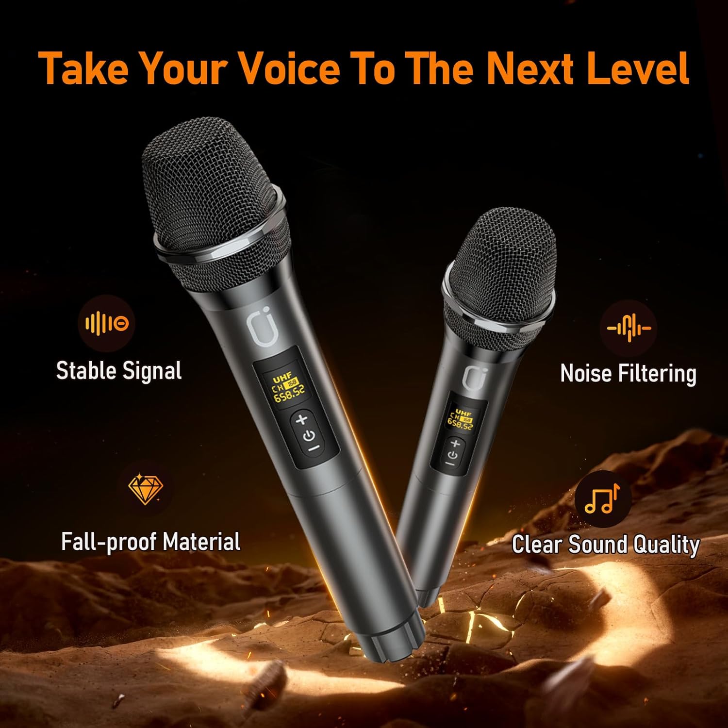 - 【2 UHF-Funkmikrofone und Fernbedienung】UHF-Mikrofone verbessern die Signalqualität und reduzieren Störungen. Mit der Fernbedienung können Sie die Songs und Wiedergabemodi auf der Karaoke-Lautsprecher ganz einfach wechseln.