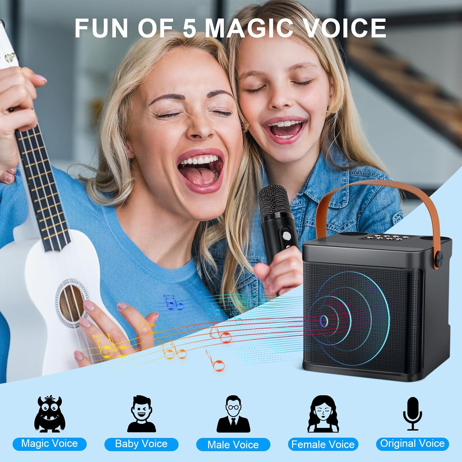 - âšăLustige KlangverĂ€nderungăDas Karaoke-System mit 2 Mikrofonen bietet Ihnen ausserdem viele interessante StimmverĂ€nderungen. Klicken Sie auf die SchaltflĂ€che âTonâ, um zwischen Babystimme, MĂ€nnerstimme, Frauenstimme, magische Stimme und