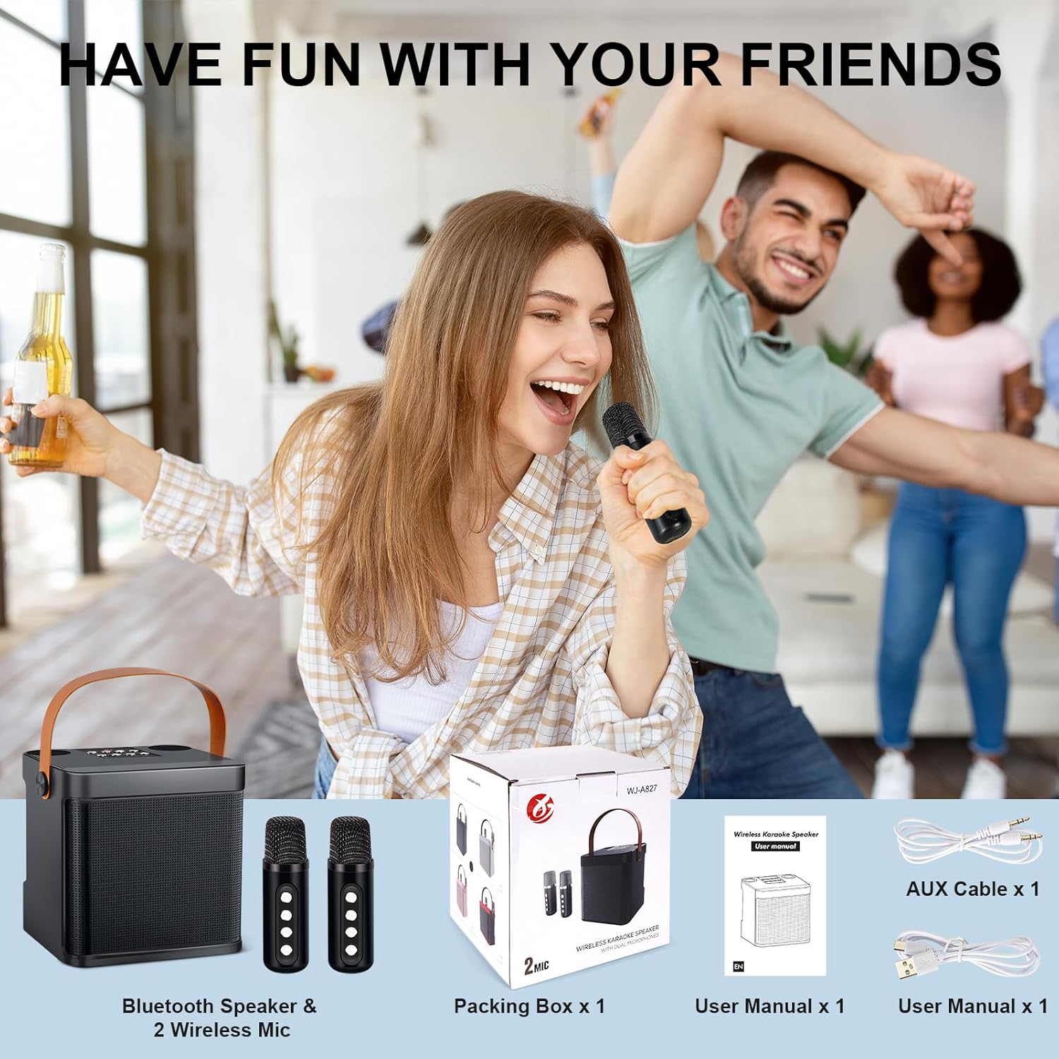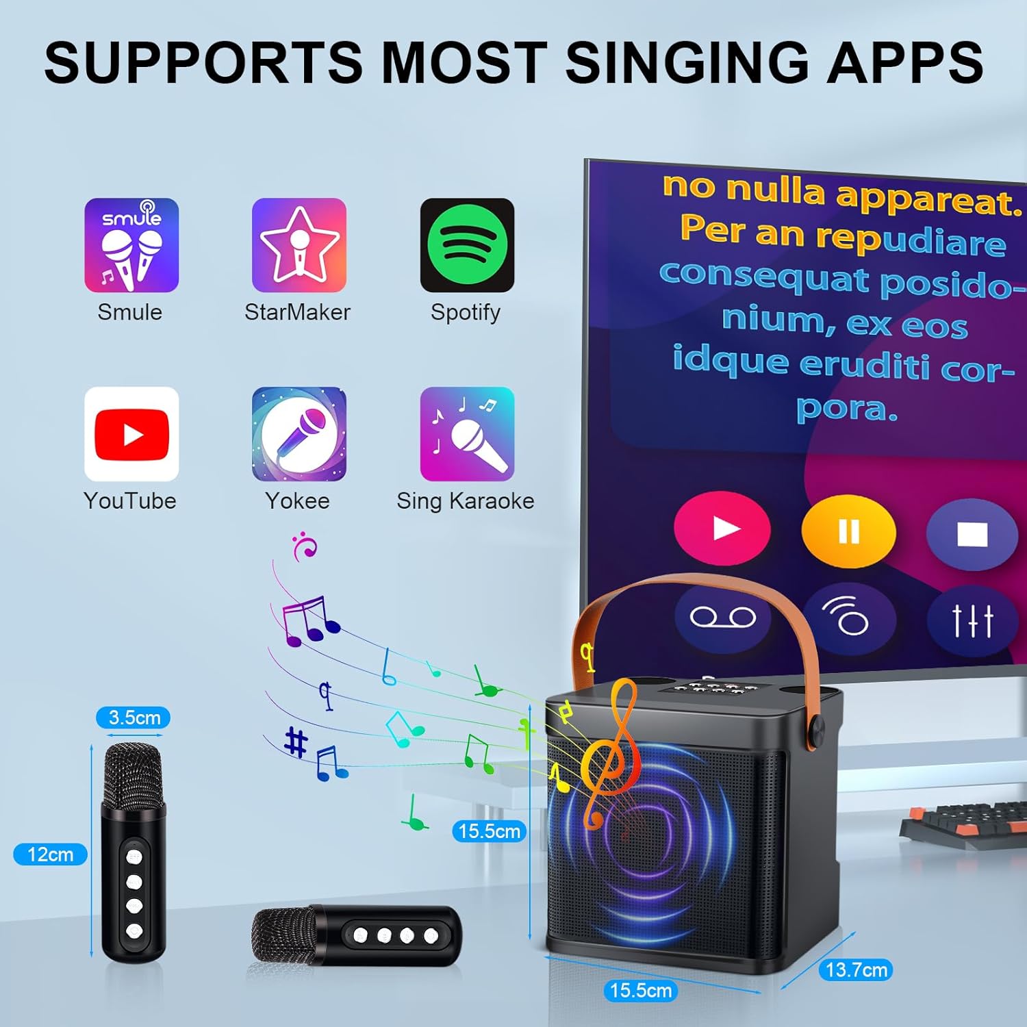 - đ€ăKaraoke Maschine mit 2 kabellosen MikrofonenăSie können Karaoke-Duette ĂŒben oder Gesangswettbewerbe mit Familie und Freunden veranstalten. Mit unserer tragbaren Karaoke-Maschine können Sie jederzeit und ĂŒberall ein mobiles Gesangsstudio