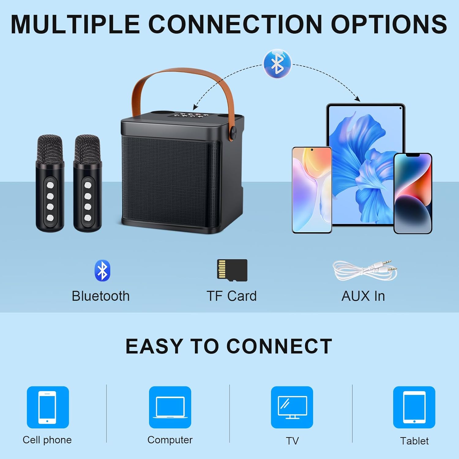 - đ±ăWeitgehend KompatibelăHierbei handelt es sich um eine Bluetooth Karaoke Anlage, welche ganz einfach mit Ihrem Smartphone, Tablet oder TV verbunden werden kann. Unser Karaoke Set unterstĂŒtzt Bluetooth 5.0, USB/TF-Karte/AUX und ist kompatibel mit