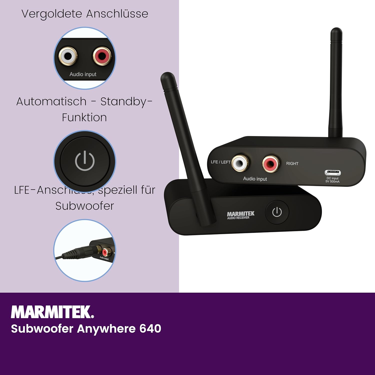 - SUBWOOFER FUNKÜBERTRAGUNG - Senden Sie mit dem Subwoofer Anywhere 640 das Subwoofer (LFE) Signal von Ihre Heimkino / Home Cinema Set zum bedrahtete Subwoofer.