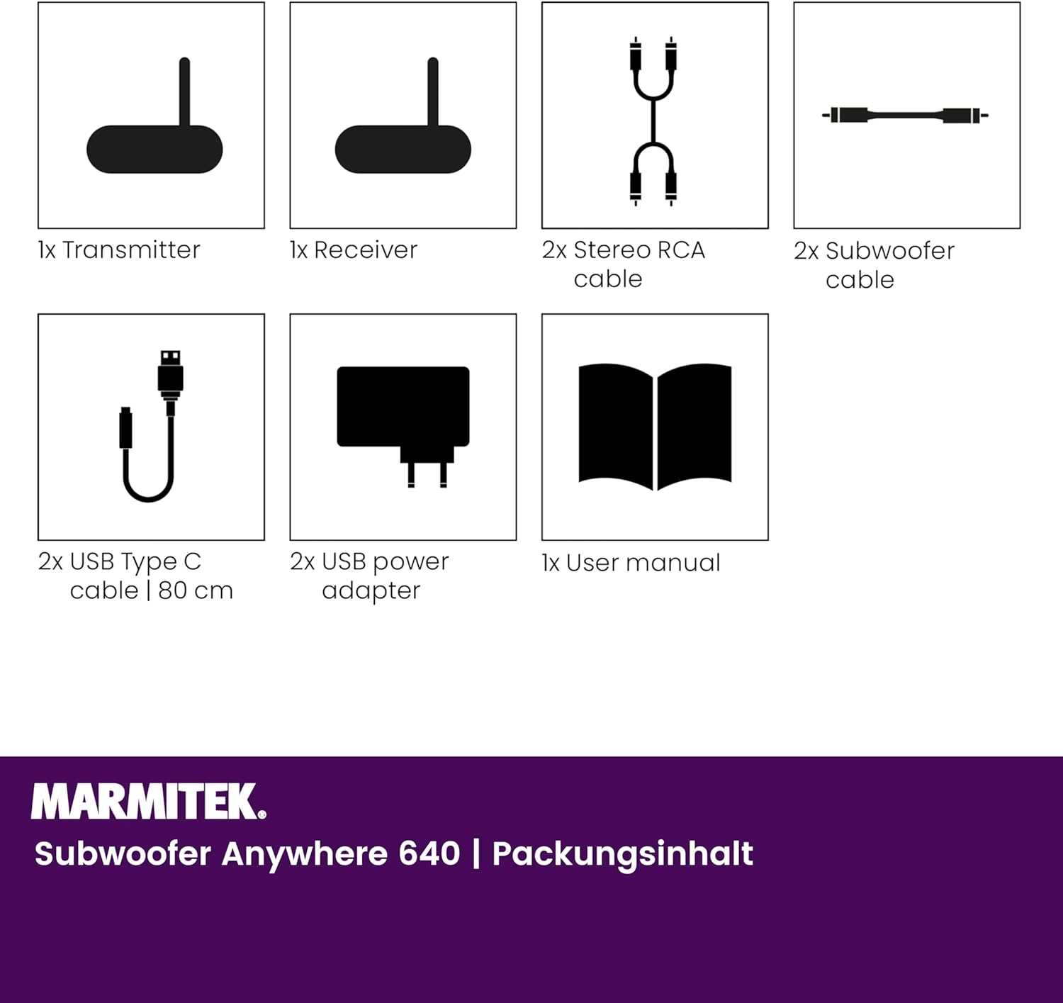 - PLUG & PLAY - Der Subwoofer Anywhere 640 ist Plug & Play. Sie brauchen keine zusätzliche Software zu installieren. Sie verbinden Sender (Transmitter) und Empfänger (Receiver) und können sofort Audio übertragen.