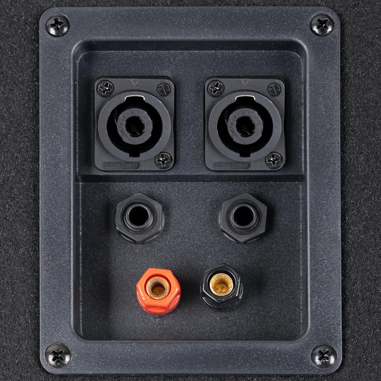 - 1 x Speakon-kompatibler Eingang, 1 x Speakon-kompatibler Ausgang, 2 x 6,3mm-Klinke-Eingang, 1 x vergoldeter Stereo-Schraubklemmen-Eingang
