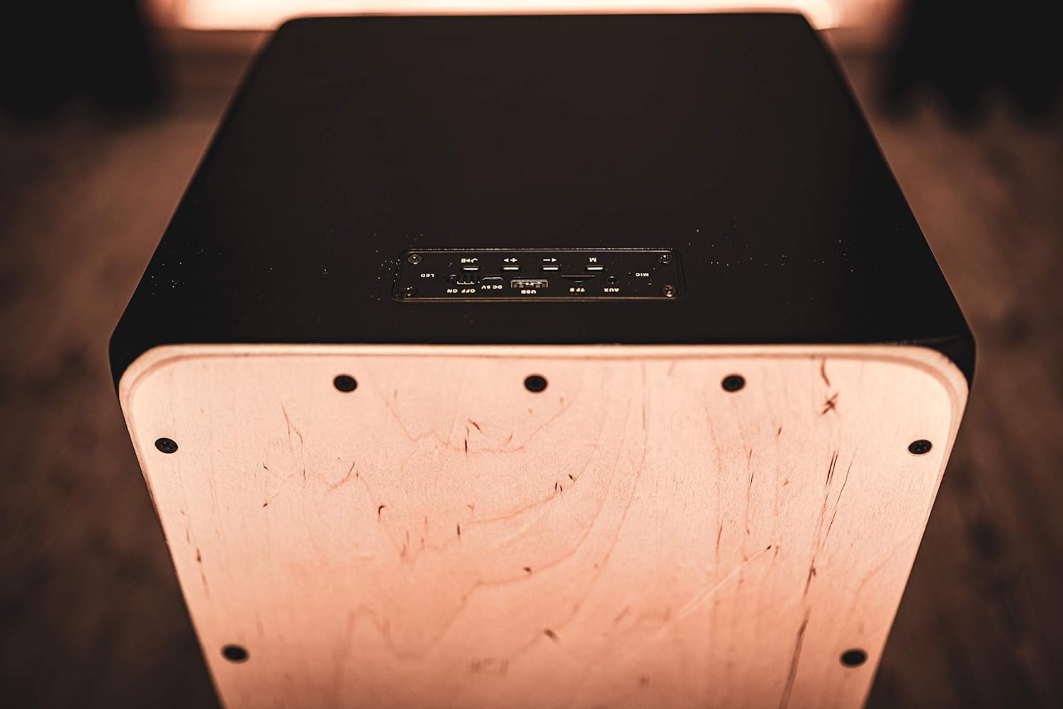 - Control-Panel - Die Speaker Cajon eignet sich perfekt, um zur Musik zu üben, Loops zu einem Akustik-Set hinzuzufügen oder einfach Spass beim Spielen zu den Lieblingsliedern zu haben. Ein Control-Panel auf der Oberseite der Cajon ermöglicht ein