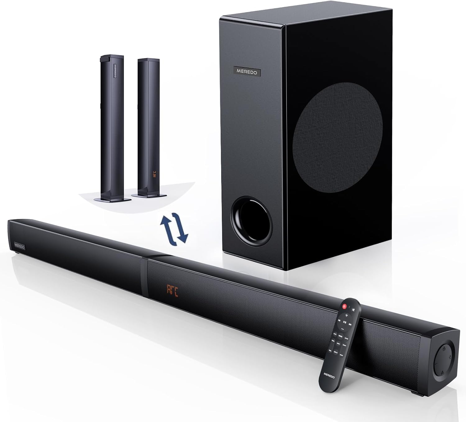 - Hinweis: Die MEREDO Soundbar unterstützt keine Dolby-Audioquellen und kein Alexa. Bitte beachten Sie, dass die linken und rechten Teile unserer Soundbar sowie der Subwoofer alle eine kabelgebundene Verbindung benötigen.Beim Übertragen mit einem