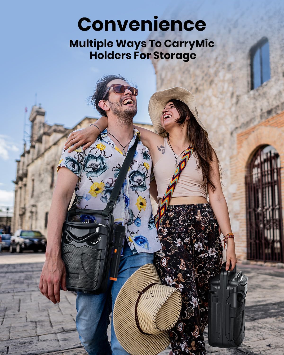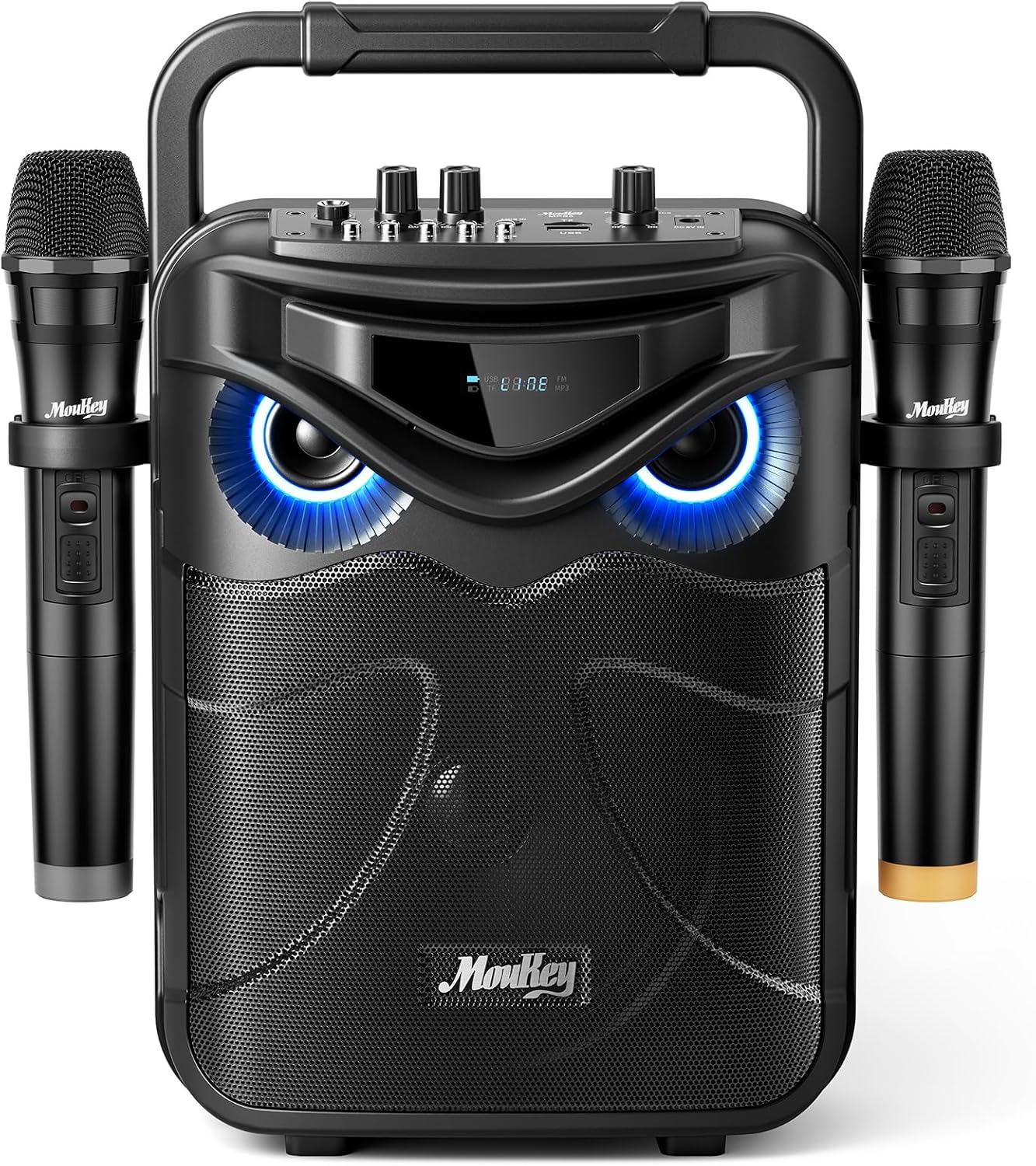 - đ€ăLeicht und tragbarăDas Moukey MPS3 Karaoke-System ist klein und leicht, es wiegt 2 kg, der Griff am Kopf ermöglicht es Ihnen, es jederzeit und ĂŒberall auf Partys, am Strand, im Freien usw. zu tragen.