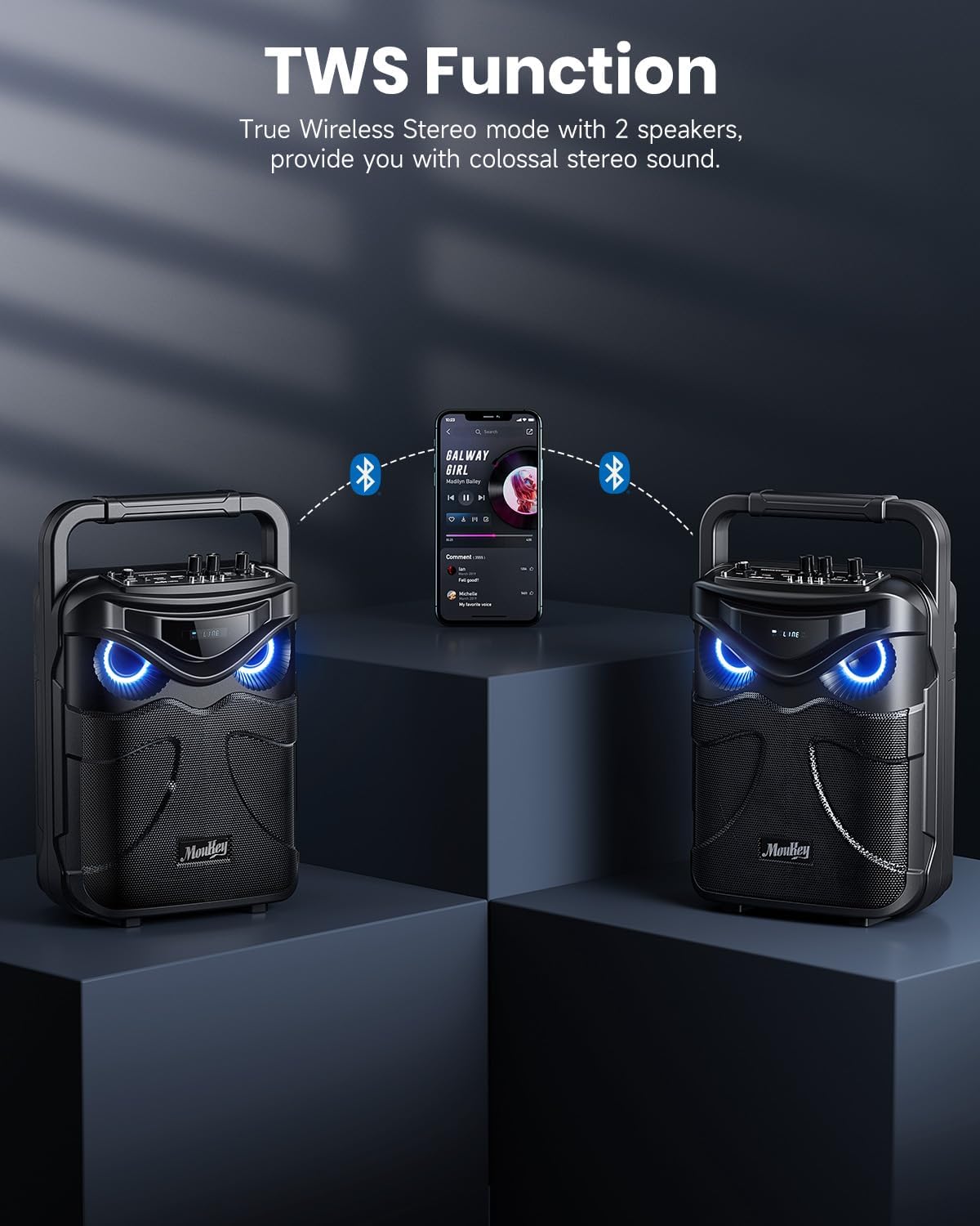- đ€ăAusgezeichneter Karaoke-SoundăDie Moukey MPS3-Karaokemaschine ist mit einem 6,5-Zoll-Tieftöner und einem 1-Zoll-Hochtöner fĂŒr eine vollstĂ€ndige Stereoklangwiedergabe und VerstĂ€rkung Ihrer Stimme ausgestattet, wodurch auch der Bass
