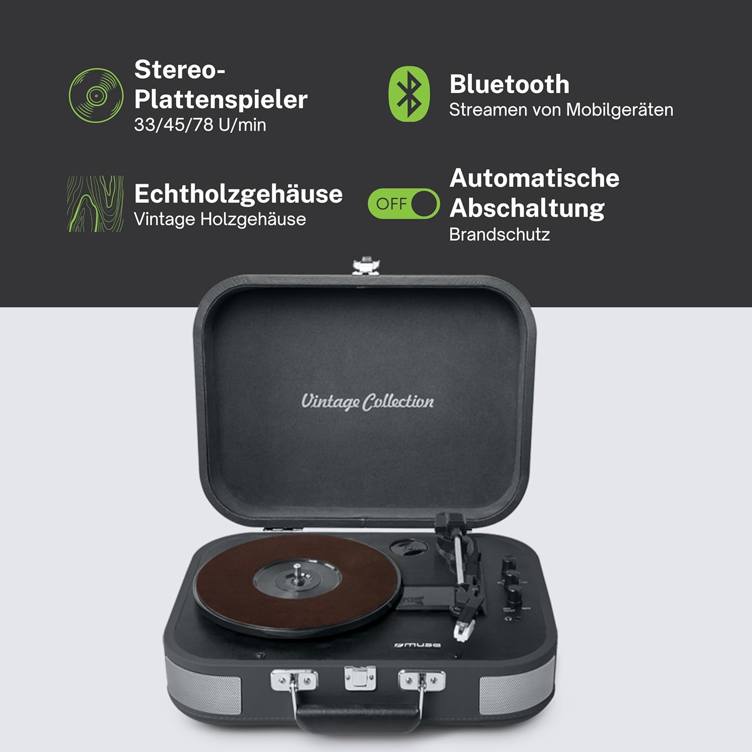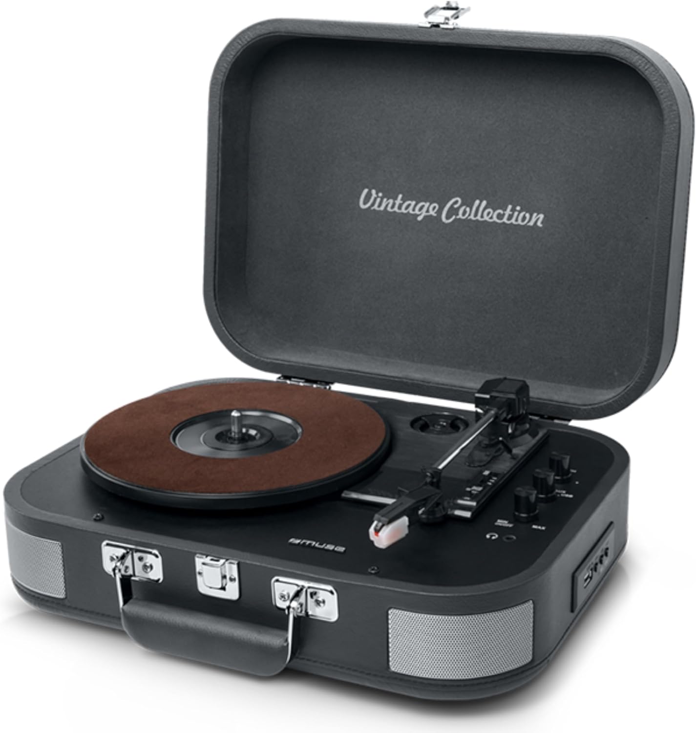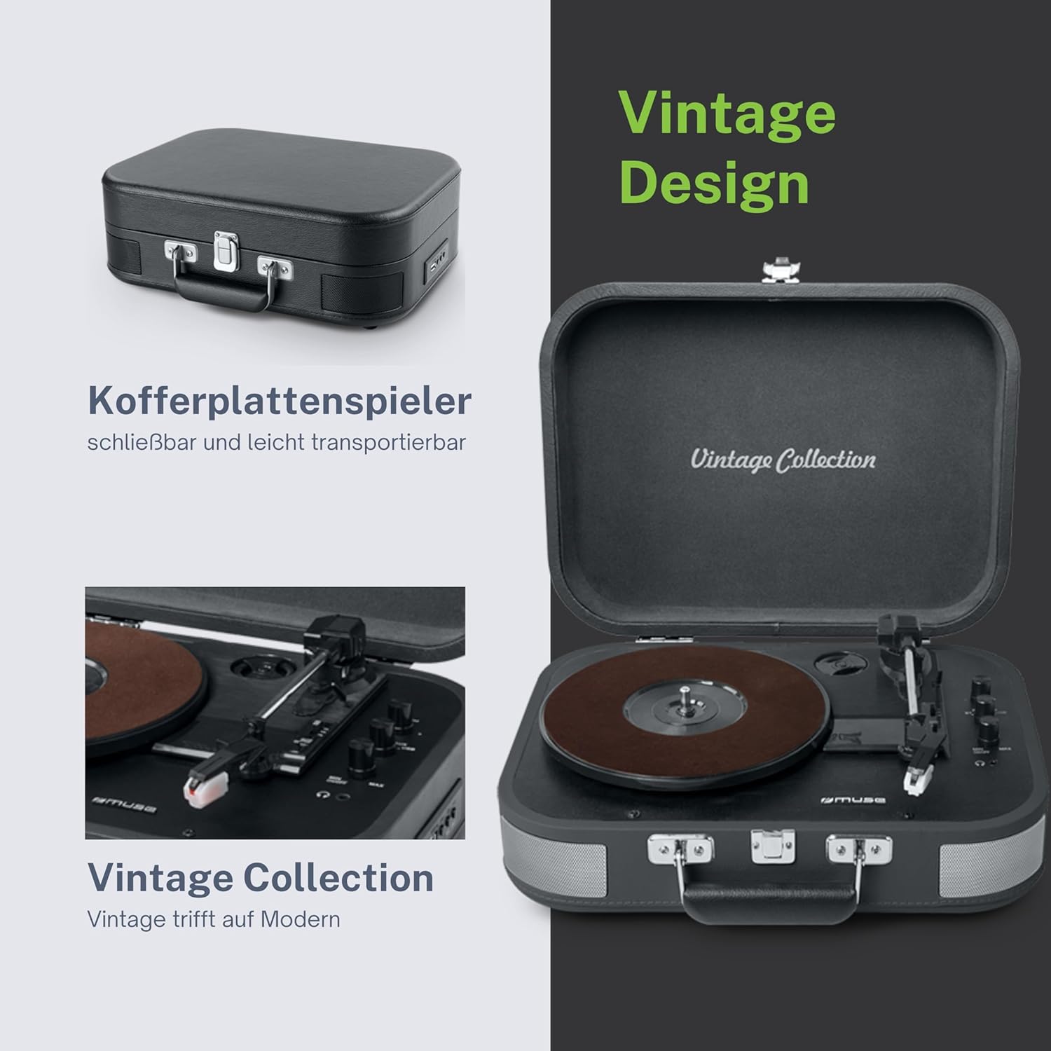 - Lieferumfang: Kofferplattenspieler, Netzteil, Ersatz-Tonabnehmernadel, 45 RPM Adapter, Bedienungsanleitung.
