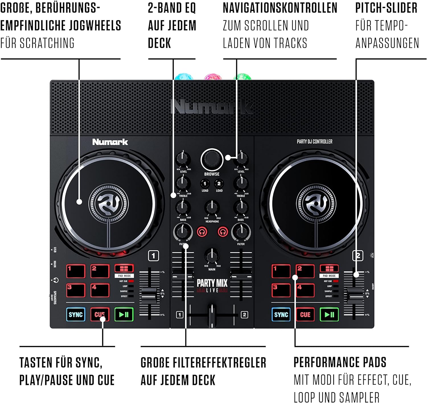 - Performance Pads mit 4 DJ-Effekten - Effect, Cue, Loop und Sampler; Ausserdem Filterregler und Pitch-Slider auf jedem DJ-Deck; Navigationskontrollen zum Browsen / Laden von Tracks