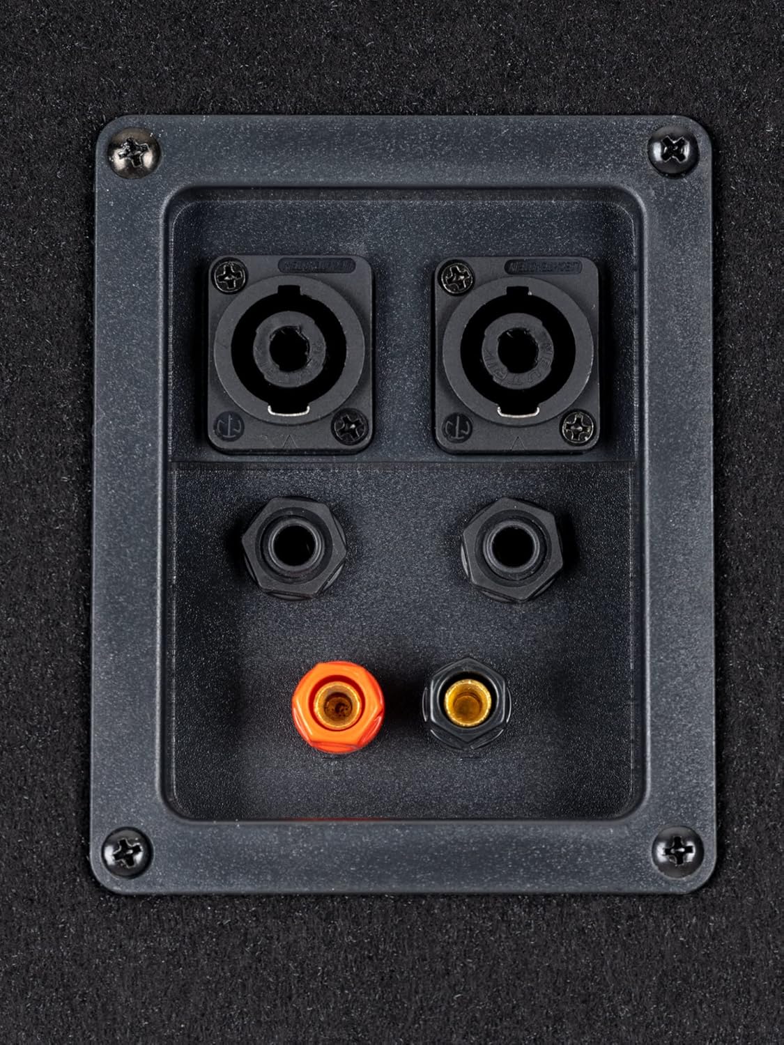 - Anschlusspanel: 1 x Speaker-Eingang, 1 x Speaker-Ausgang, 2 x 6,3mm-Klinke-Eingang, 1 x vergoldeter Stereo-Schraubklemmen-Eingang