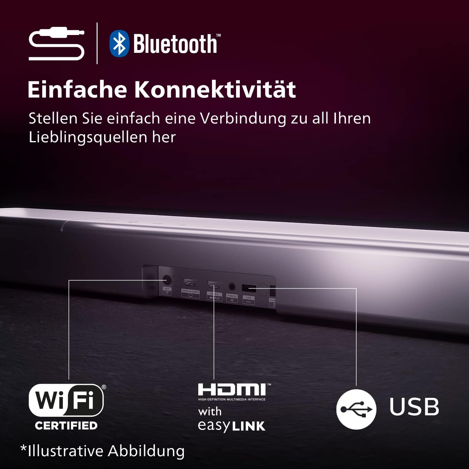 - DTS PLAY-FI: Diese kompakte Soundbar liefert DTS Play-Fi Konnektivität, sodass Sie kompatible Lautsprecher für Multiroom-Audio und echte Surround-Sound-Setups synchronisieren können. Mit DTS Play-Fi und der Philips Sound App können Sie Ihre Sounds in