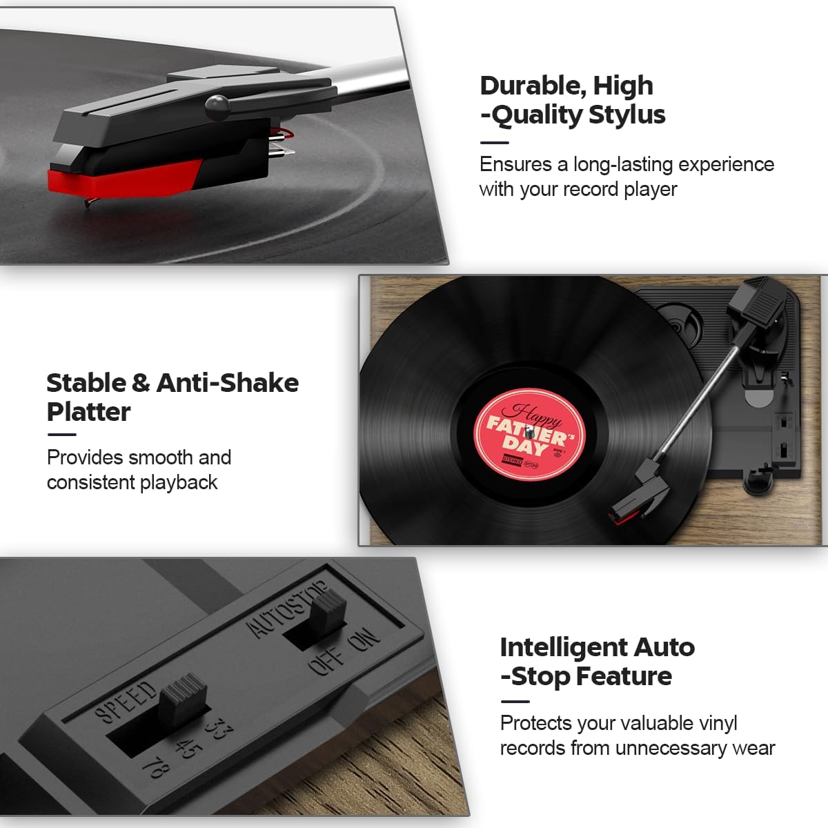 - đ”ă3 AusgewĂ€hlte Geschwindigkeiten und StaubschutzăDer neu gestaltete tragbare Plattenspieler dreht alle Ihre 7", 10" und 12" Vinylplatten mit einstellbaren 3 Geschwindigkeiten (33 1/3, 45, 78 U/min). Ein moderner Vinyl Player stoppt automatisch