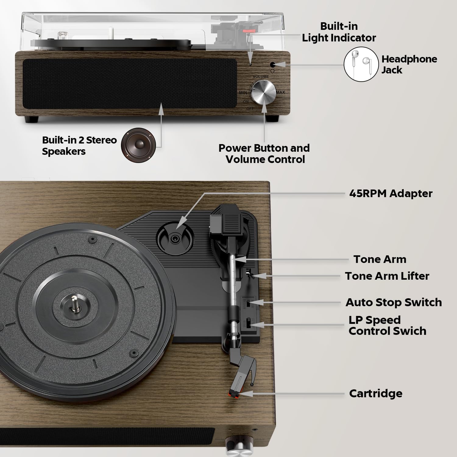 - đăRetro-Look und Moderne Kombinationă Klassischer Plattenspieler Retro mit schöner natĂŒrlicher Holzoptik, Vintage-Charme mit moderner Technologie machen diesen erschwinglichen Plattenspieler ideal fĂŒr AnfĂ€nger und Vintage-Enthusiasten
