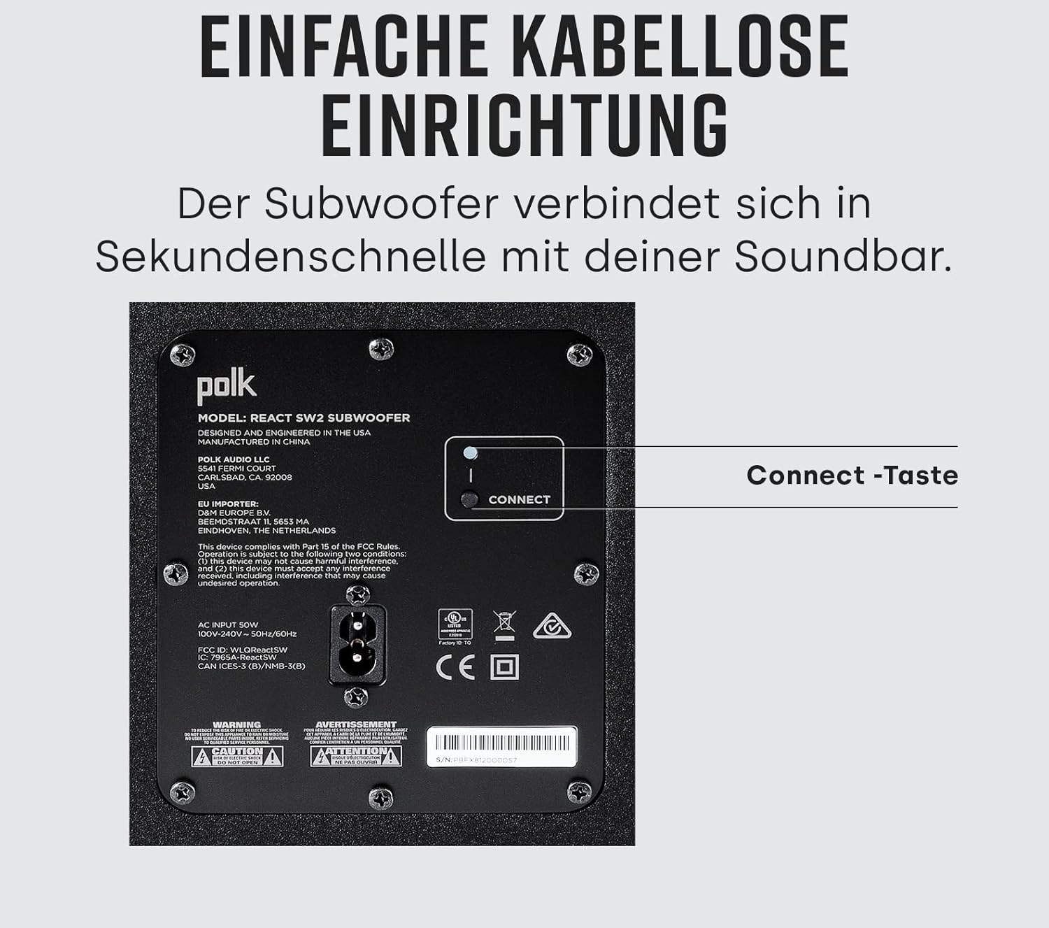 - 5.1 HEIMKINOSYSTEM - Fügen Sie die Bass Box zur React Soundbar hinzu, um ein 2.1-System zu erstellen. Fügen Sie später zwei Polk SR2 Surround Lautsprecher hinzu für ein kabelloses 5.1 Heimkino Soundsystem
