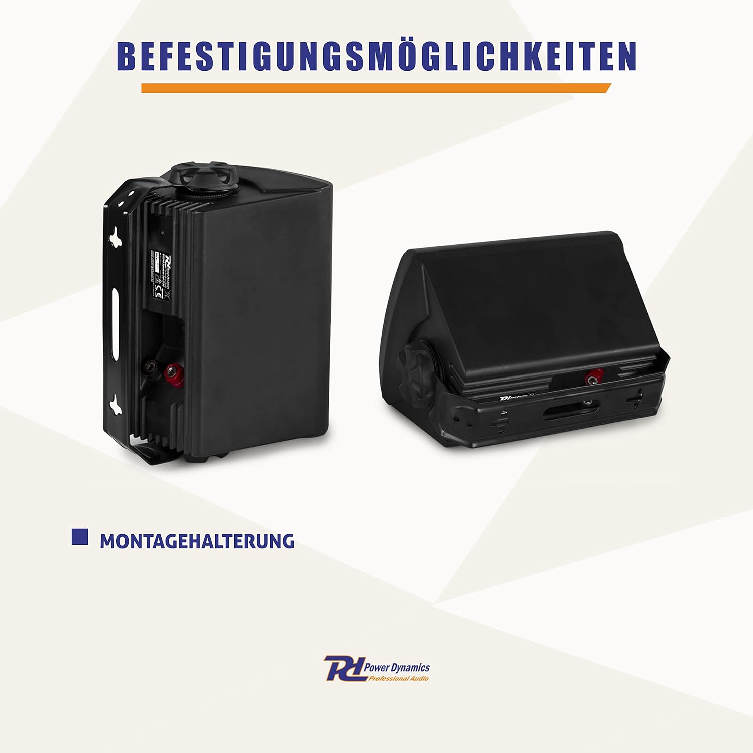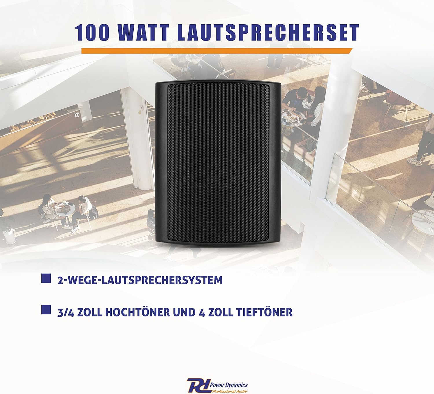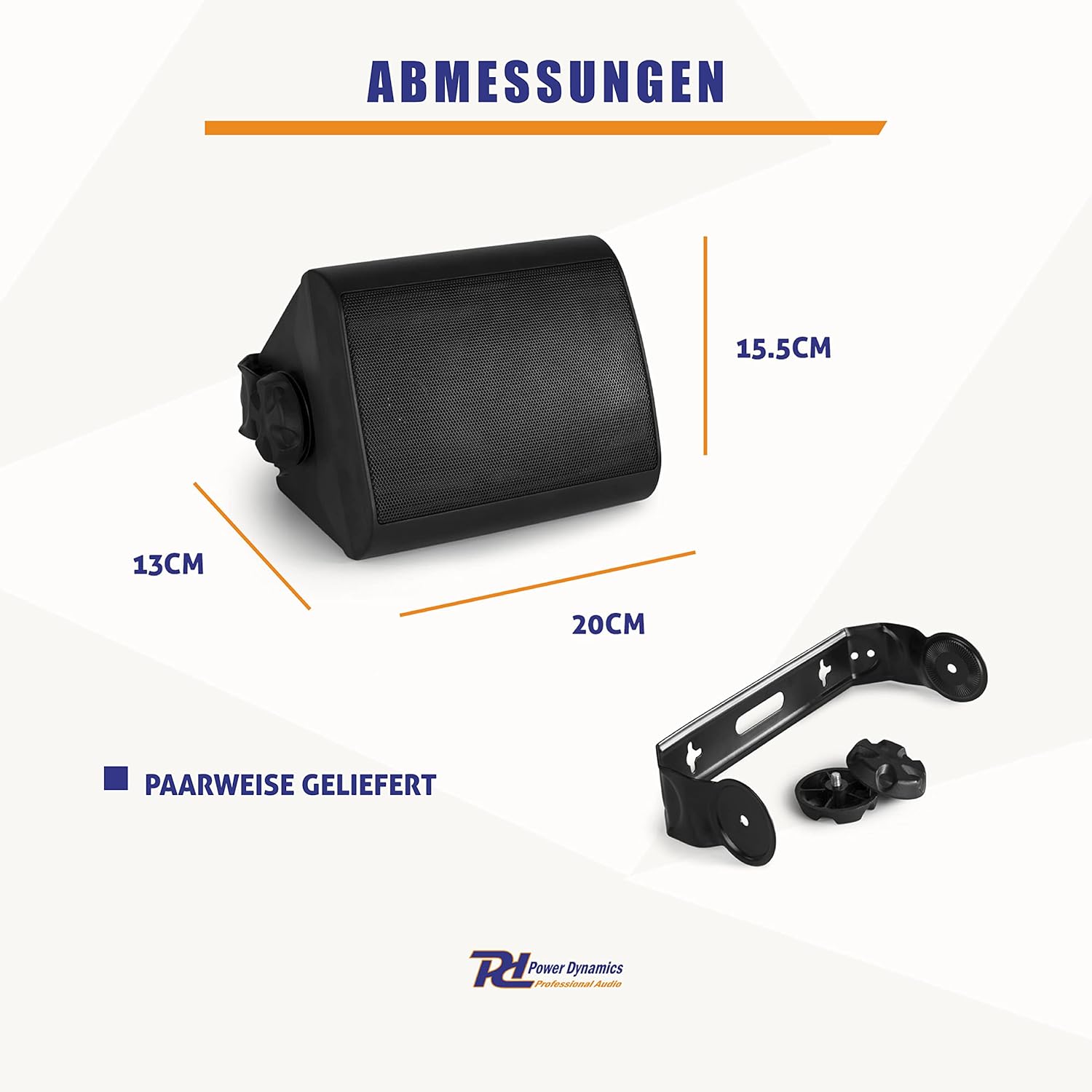 - Das Power Dynamics BGO40 ist ein kompaktes schwarzes 200-Watt-Lautsprecherset für Hintergrundmusik im Innen- oder Aussenbereich