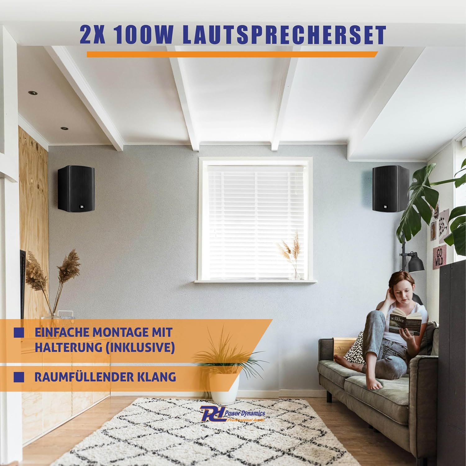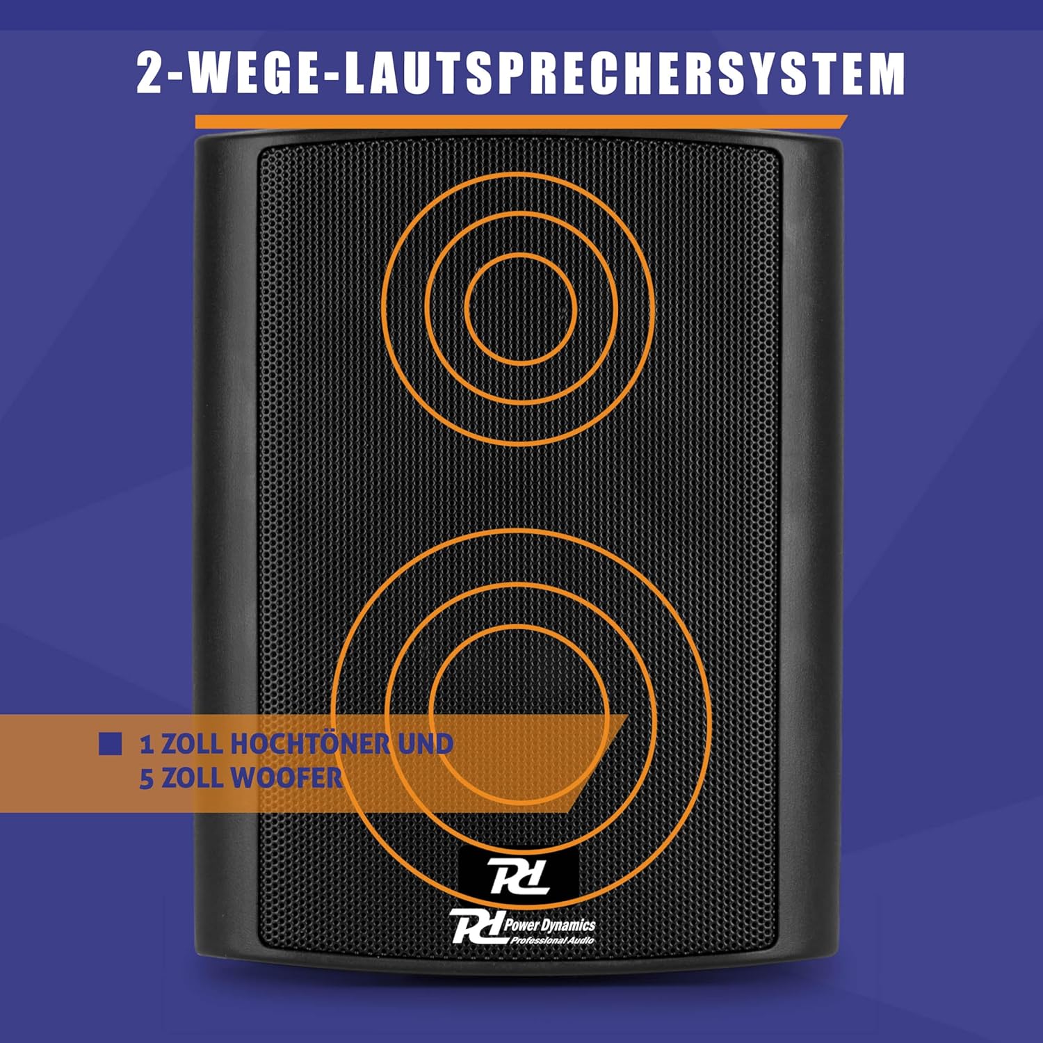 - Die 5 Zoll Lautsprecher haben eine Leistung von jeweils 100 Watt, zusammen ergibt das also 200 Watt Beschallung für eine Bar ein Restaurant oder für die eigenen 4 Wände