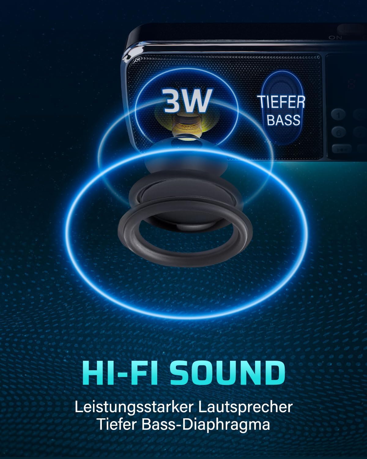 - 📻Dualer Lautsprecher mit Heavy Bass: Bei aller Liebe zum guten Radio:Die Klangqualität sollte nicht „von gestern“ sein! Der duale 3W-Magnetlautsprecher liefert kristallklare Höhen gepaart mit knackigem Bass – ein Klang, der sich auch im