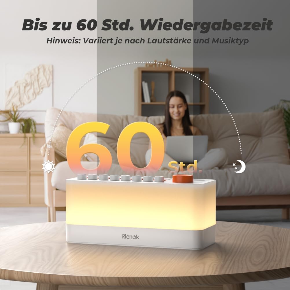 - Bluetooth Lautsprecher Sound Machine: 10W, 2600 mAh Akku, bis zu 60 Stunden Laufzeit (abhängig von Helligkeit und Lautstärke). Dimmbare Nachtlicht sorgt für sanftes Licht, das beim Einschlafen und Entspannen hilft.Passend für Yoga, Meditation und
