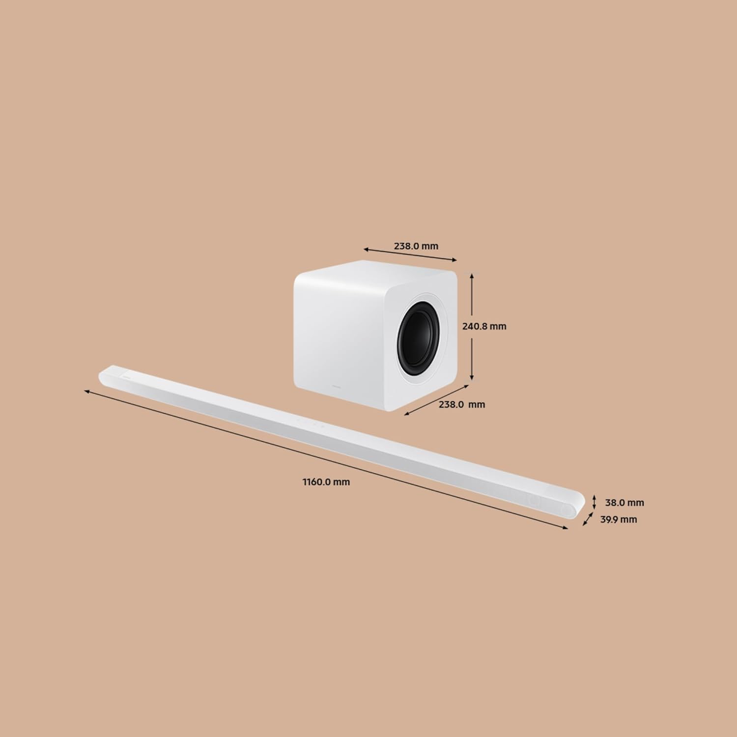 - Inhalt: 1x Samsung Soundbar HW-S801D/ZF S-Serie inkl. Fernbedienung und Wandhalterung, Abmessungen Hauptlautsprecher (LxBxH): 116.0 x 3.8 x 4.0 cm, Gewicht: 1,4 kg, Farbe: Weiss