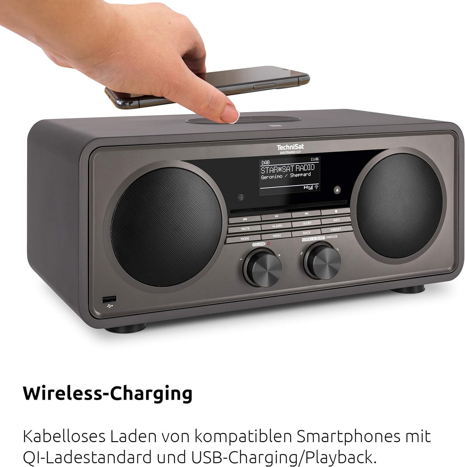 - Einfache Bedienung: Das Radio kann über die TechniSat Connect App sowie die mitgelieferte Fernbedienung bedient werden. Zusätzlich können Smartphones über den USB Anschluss und die Wireless Charging Funktion geladen werden