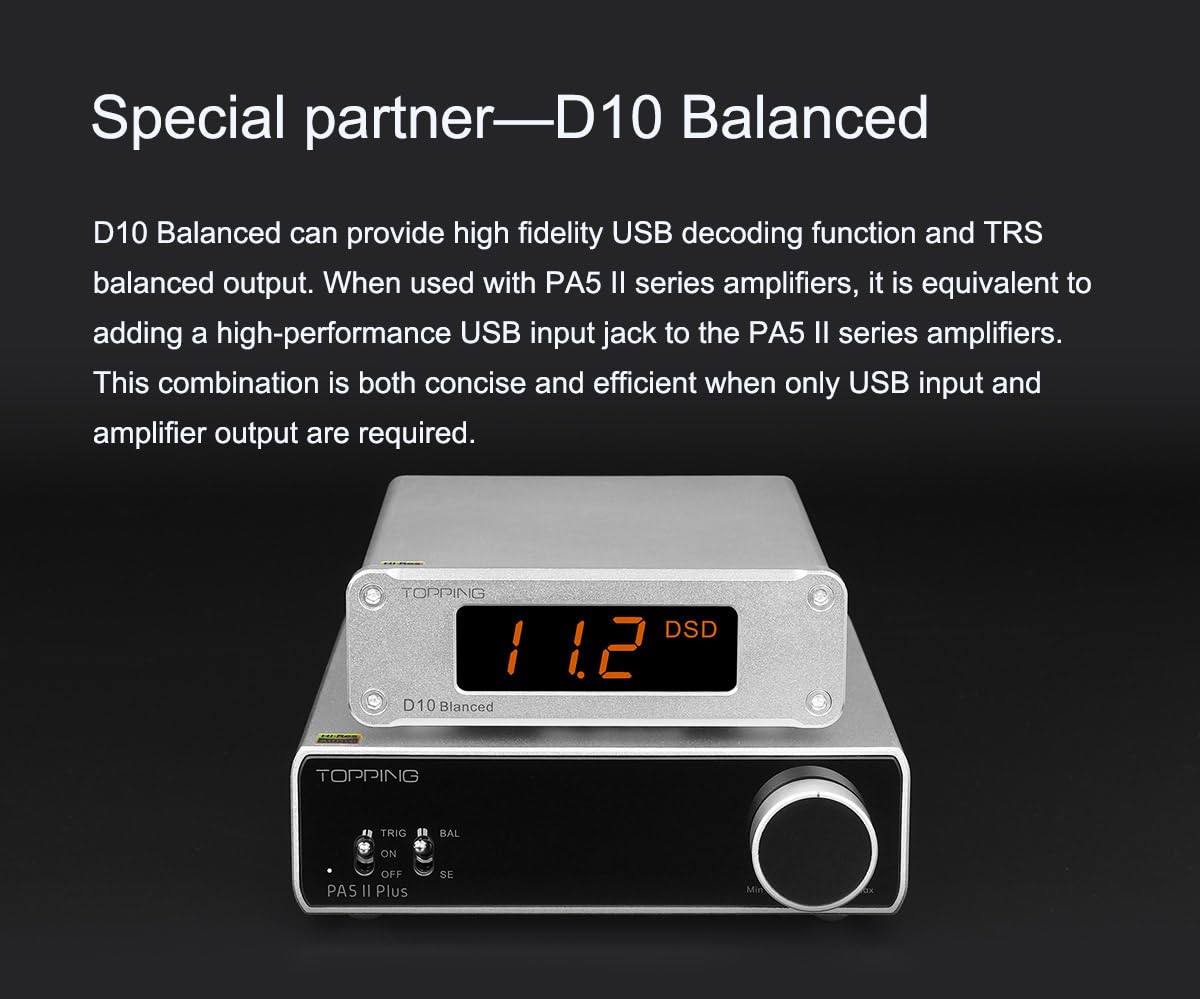 - Spezieller Partner: D10 Balanced D10 Balanced kann eine High-Fidelity-USB-Dekodierungsfunktion und einen symmetrischen TRS-Ausgang bieten. Bei Verwendung mit Verstärkern der PA5 II-Serie entspricht es dem Hinzufügen einer