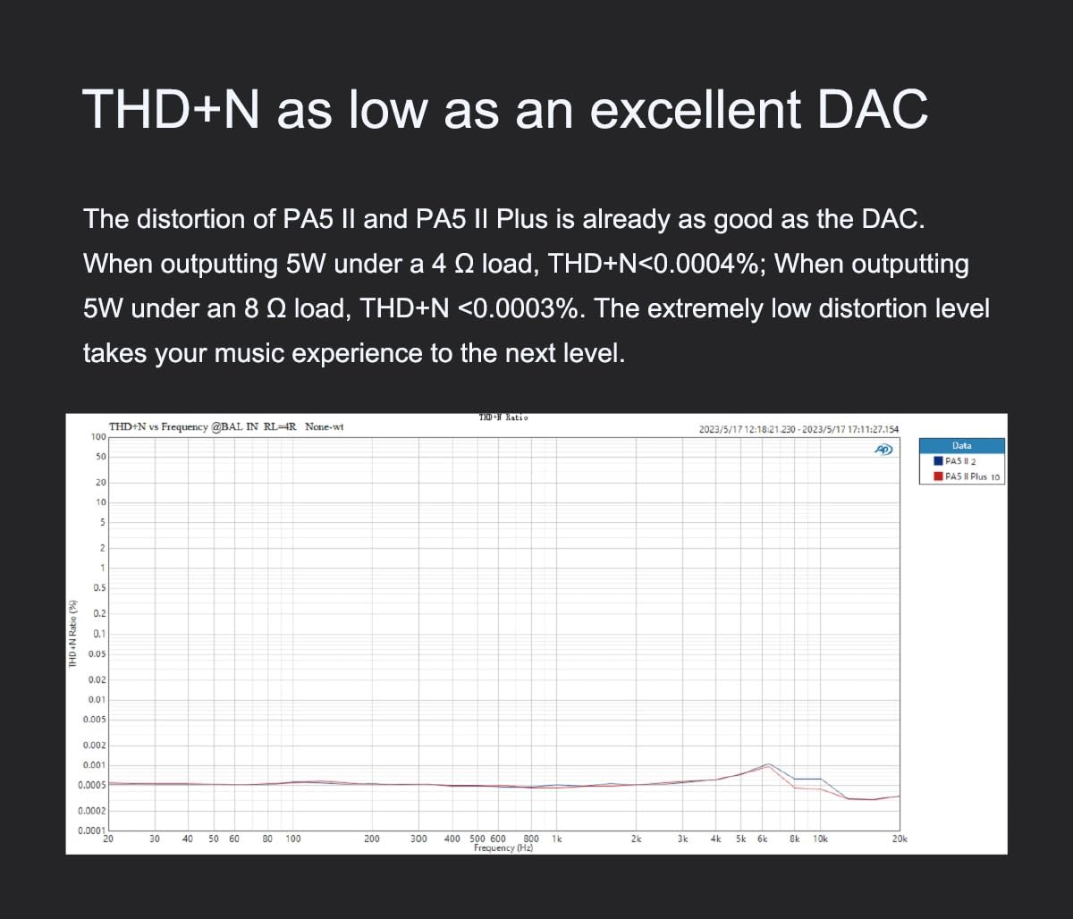 - THD+N so niedrig wie ein exzellenter DAC Die Verzerrung von PA5 II und PA5 II Plus ist bereits so gut wie der DAC. Bei der Ausgabe von 5 W unter einer 4 Q-Last THD+N