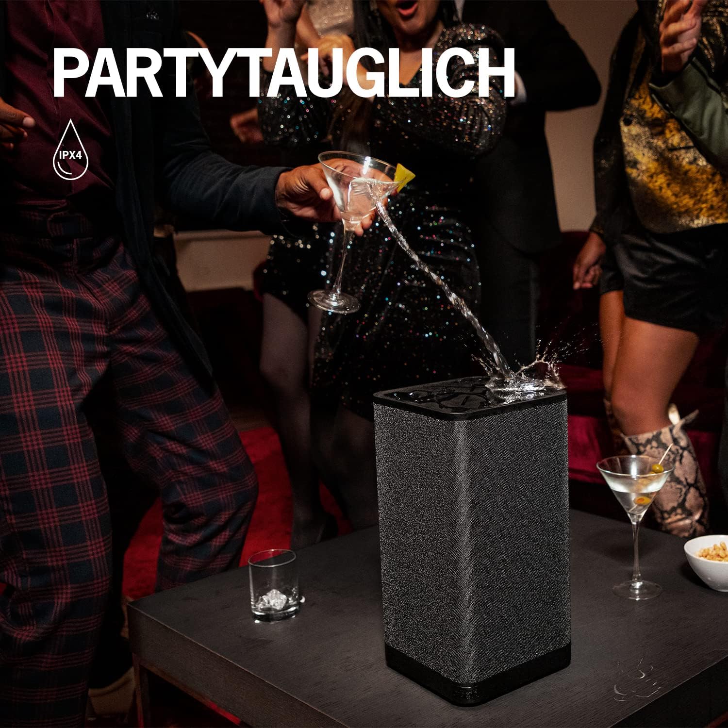 - Adaptiver Equalizer: Der kabellose Party-Lautsprecher sorgt für den richtigen Sound in jeder Umgebung; sein adaptiver EQ analysiert die Umgebung und passt den Sound automatisch an