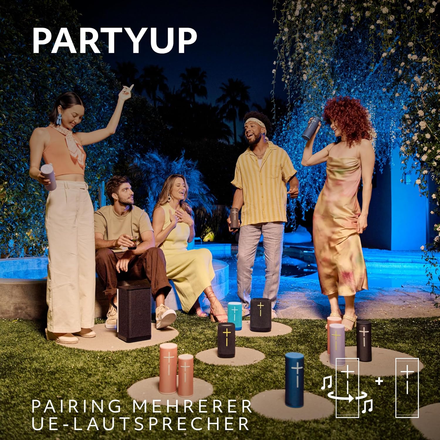 - PartyUp: Paire mit PartyUp in der Ultimate Ears BOOM-App mehrere mobile BOOM, MEGABOOM, EVERBOOM, EPICBOOM und HYPERBOOM Bluetooth-Lautsprecher und schaffe so das ultimative Surround-Sound-Erlebnis.
