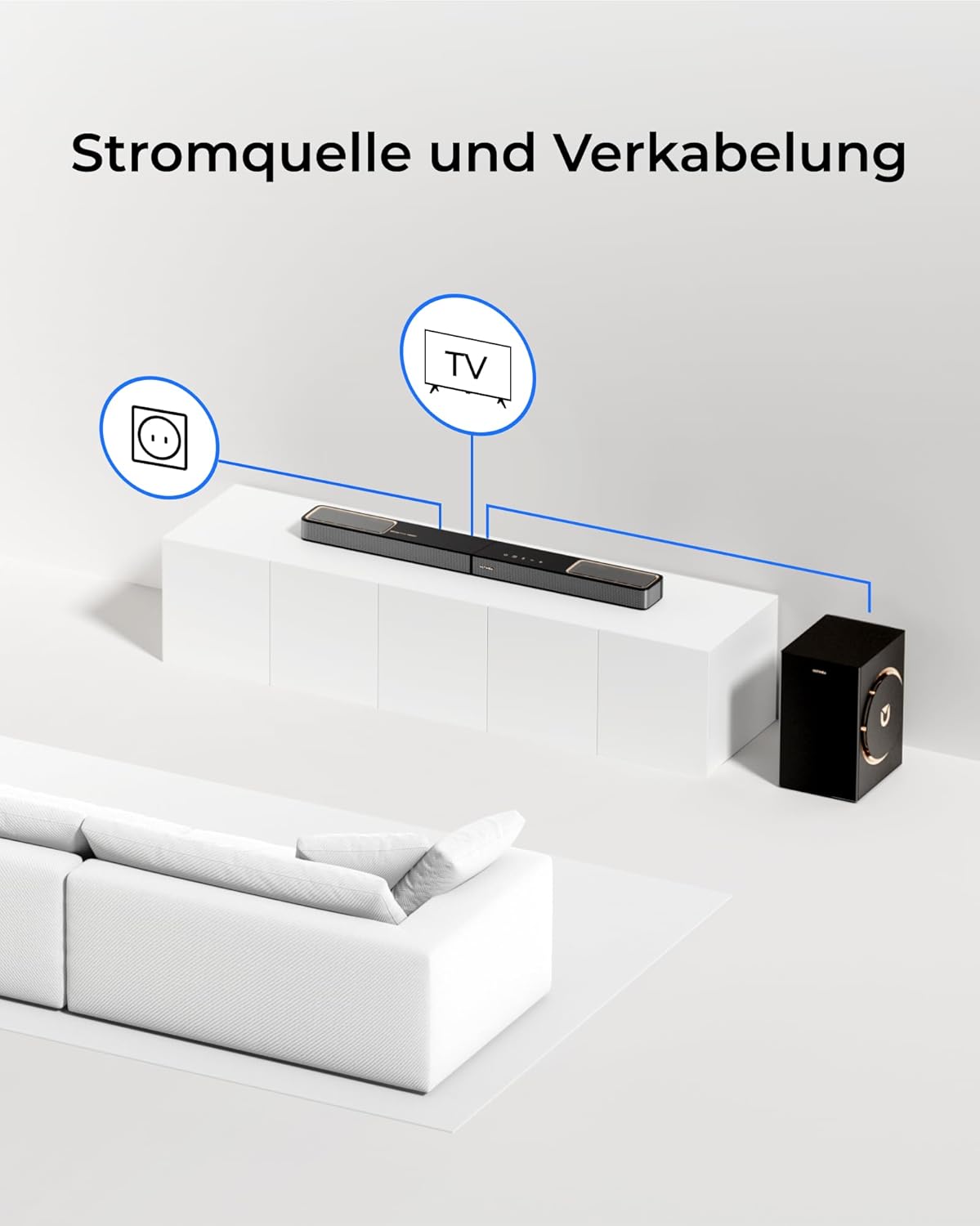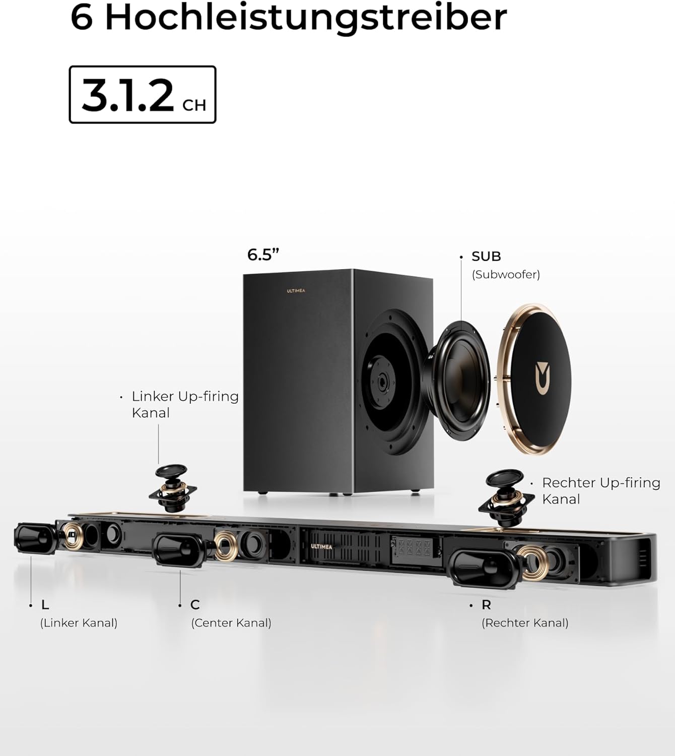 - 3.1.2ch Surround Sound System für Fernseher: Das System basiert auf der Built on 3.1.2-Kanal Architektur und kombiniert nach vorne gerichtete Treiber, nach oben gerichtete Lautsprecher, und einen 6.5 Zoll Subwoofer für mehrdimensionalen Klang - ganz