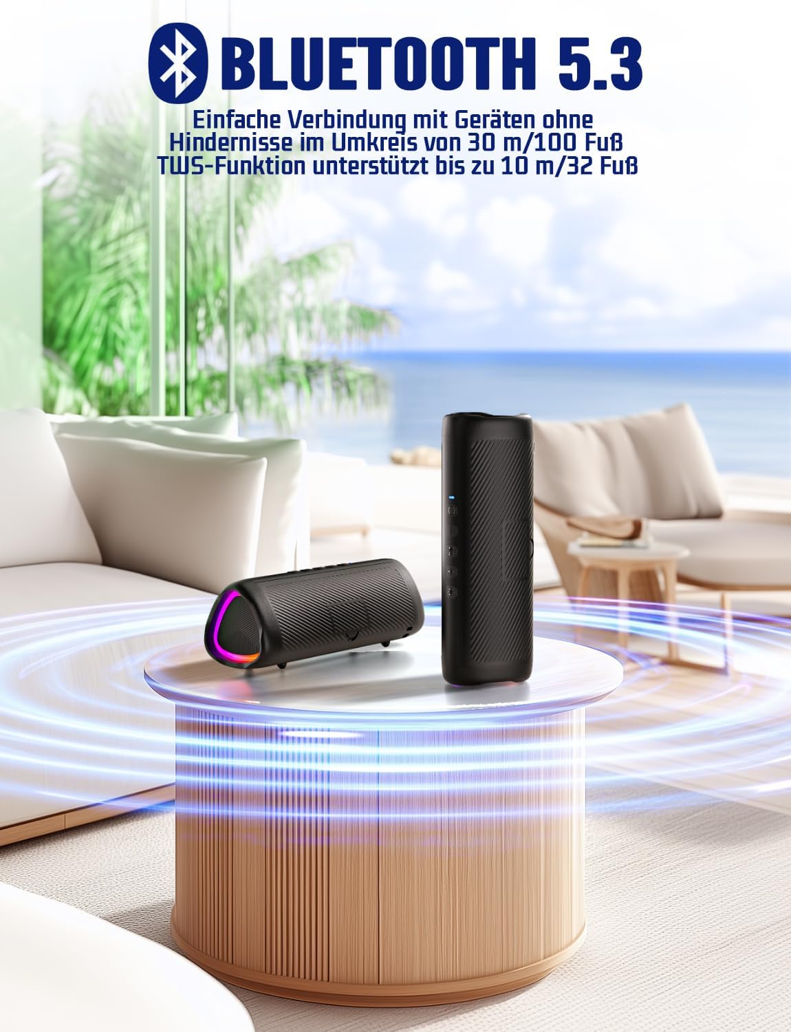 - đ¶ăBluetooth 5.3ă UOHHBOE Bluetooth Lautsprecher nimmt Bluetooth 5.3 Technologie an, die stabiler und zuverlĂ€ssiger als Bluetooth 5.0 ist. Die Verbindungsreichweite von 30 Metern unter der ZugĂ€nglichkeit ist einfach zu verbinden, um entweder