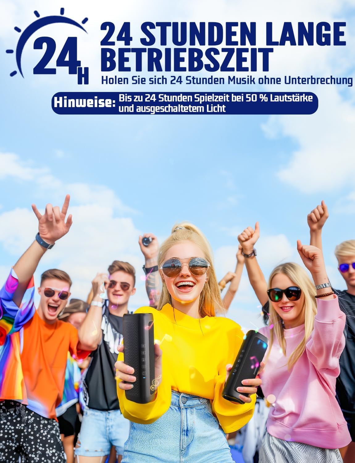 - đăLange Akkulaufzeită Unser Bluetooth Lautsprecher wird ĂŒber USB-C aufgeladen und benötigt nur 3,5-4 Stunden, um vollstĂ€ndig aufgeladen zu werden. Es kann bis zu 24 Stunden Dauerbetrieb bei 50% LautstĂ€rke und ausgeschaltetem LED-Licht dauern.