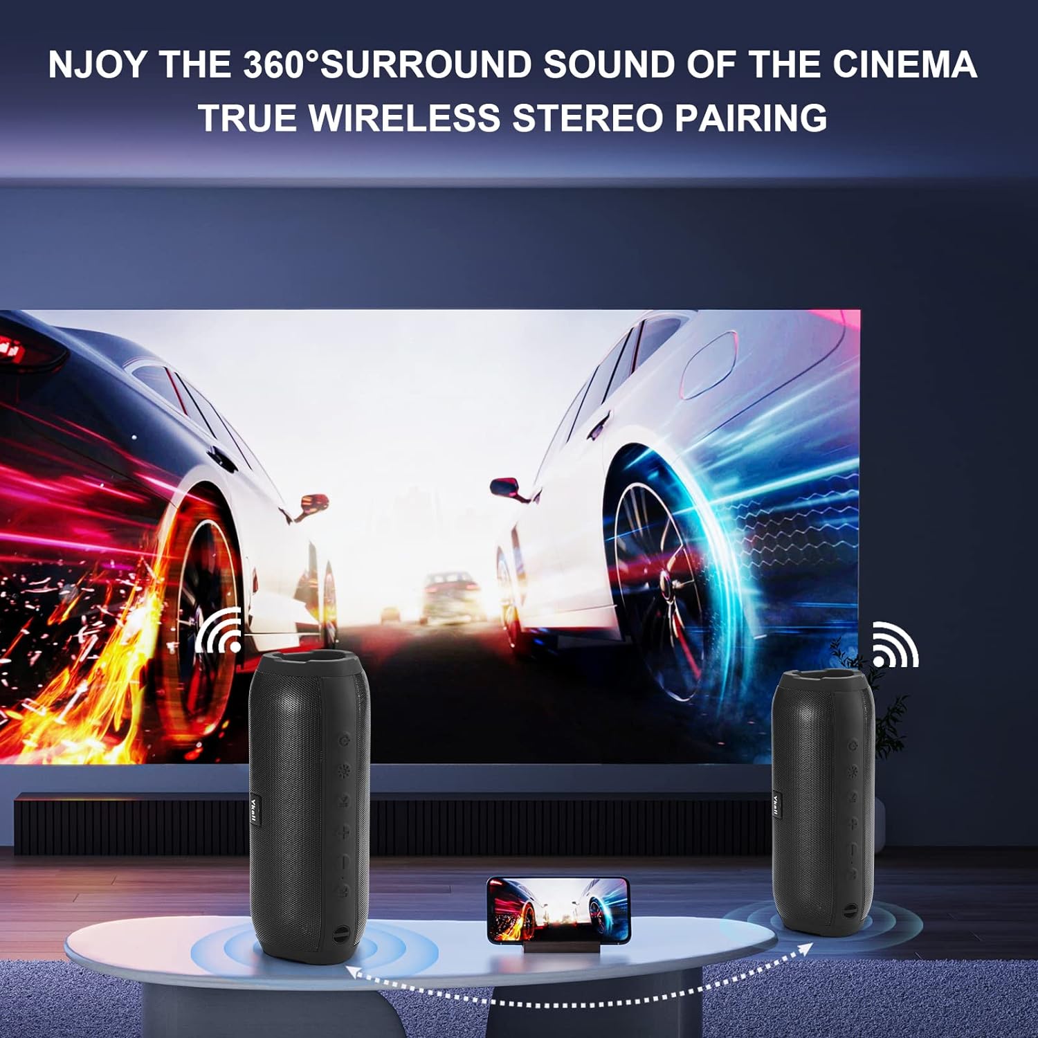 - đăKabelloses Stereo Pairing & Hi-Fi Soundă- Der Bluetooth-Lautsprecher ist mit einem 20W Stereo-Audio Treiber Lautsprecher und einem fortschrittlichen Digitalen Signalprozessor ausgestattet der bei jeder LautstĂ€rke klare Höhen und detaillierte