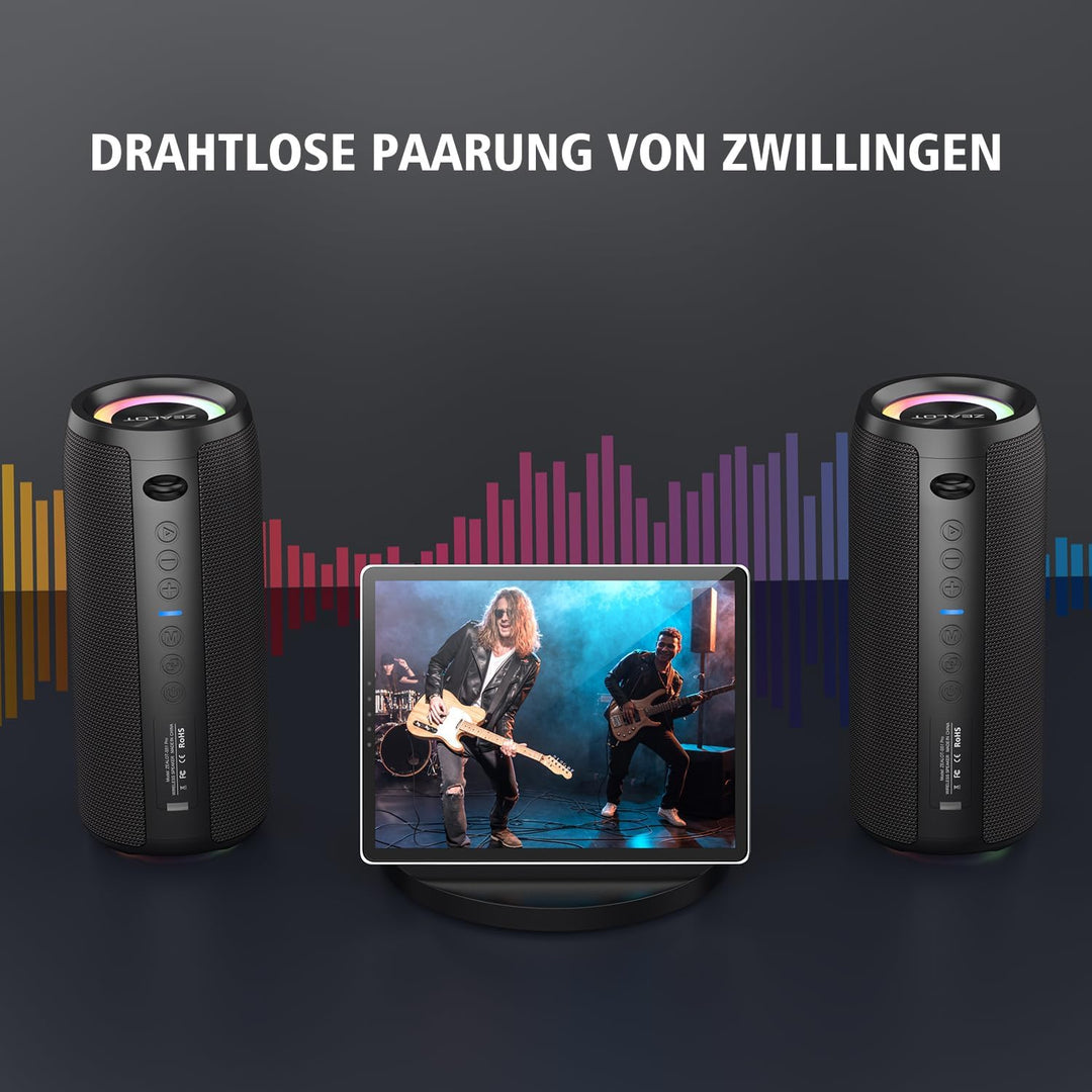 - 【Echter 360°-Stereo-Sound】Stereo sound mit wahnsinnig gutem rundumklang - Die bluetooth lautsprecher liefern einen beeindruckend kraftvollen sound,mitten und höhen,dynamischen klang.Selbst bei maximaler lautstärke, ohne störende geräusche,genau