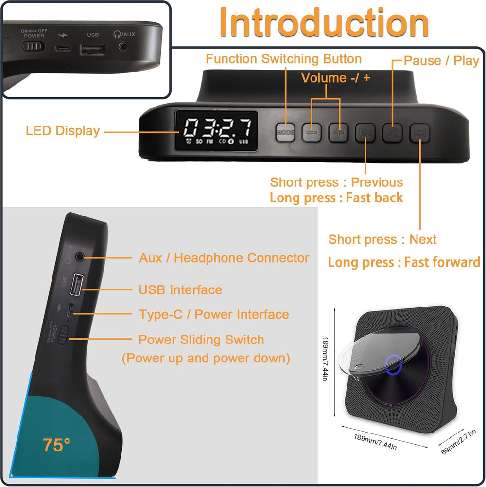 CD Player Tragbar, MONODEAL Tragbarer Bluetooth, Wiederaufladbar mit Lautsprecher und FM Transmitter
