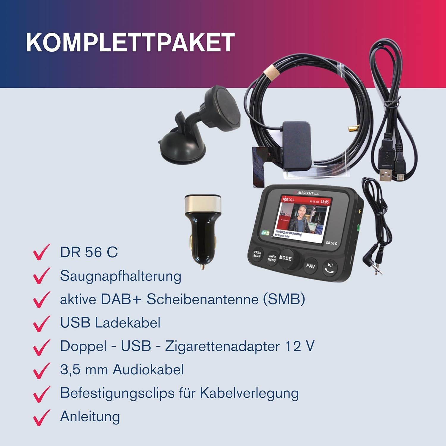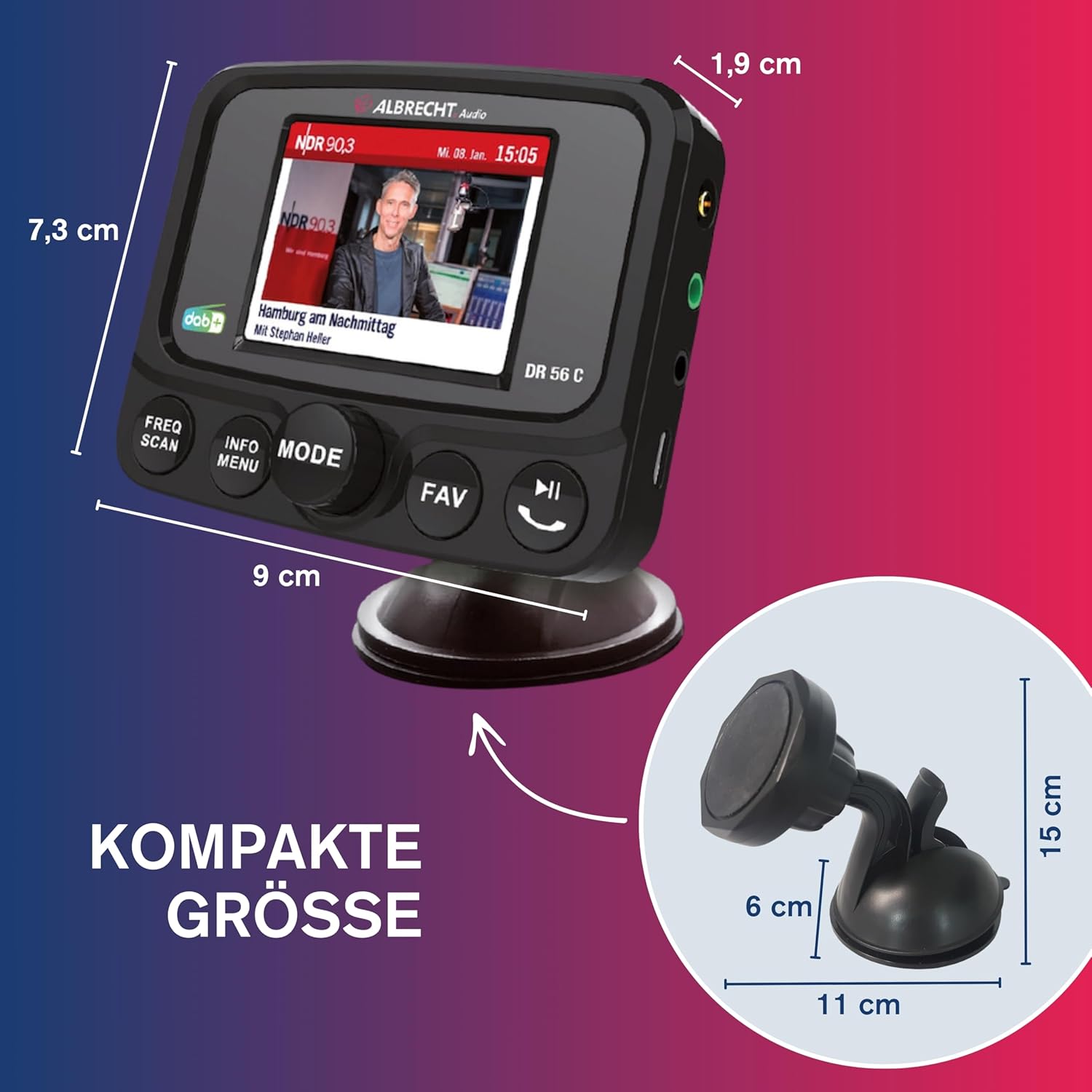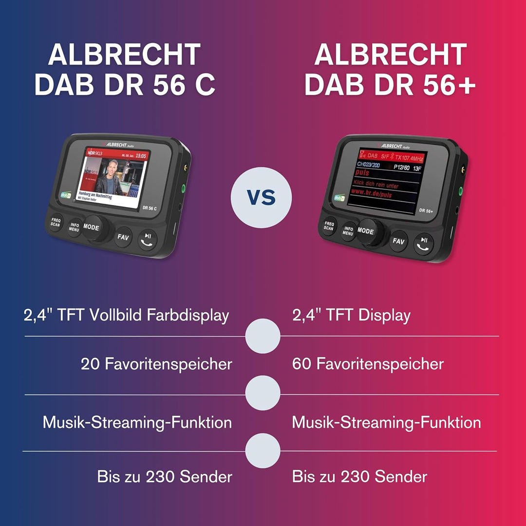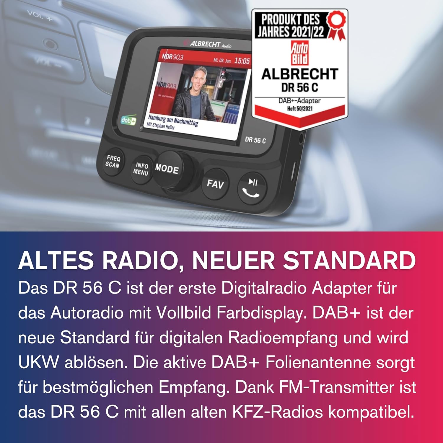 - DAB+ ist der zukünftige, bereits verfügbare Standard für den digitalen Radioempfang und wird UKW ablösen. Das DR56C ist dank FM-Transmitter mit jedem alten KFZ-Radio kompatibel.
